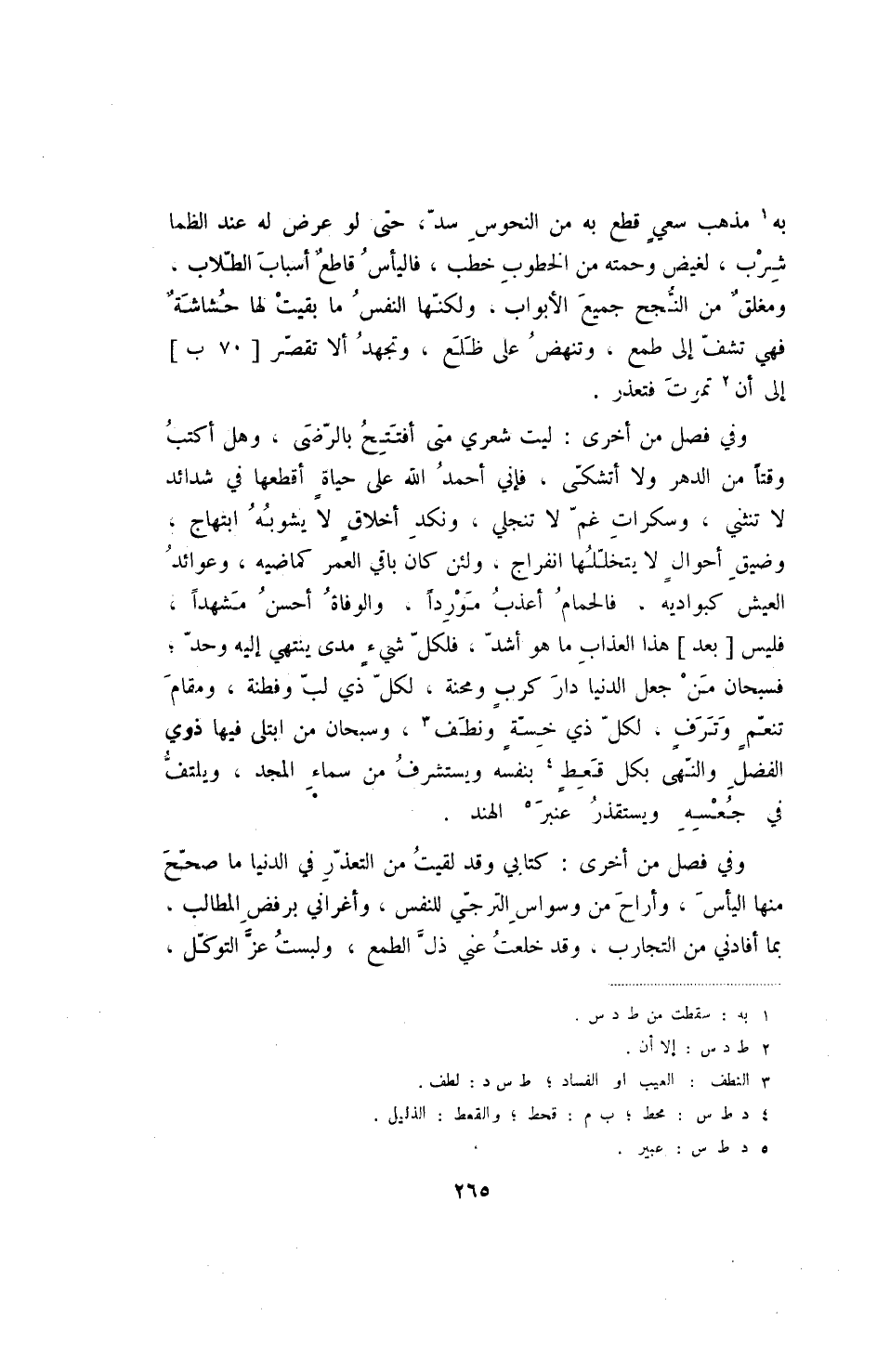 وفي فصل من أخرى: كتابي وقد لقيت من التعذر في الدنيا ما صحح منها اليأس، وأراح من وسواس الترجي للنفس، وأغراني برفض المطالب، بما أفادني من التجارب، وقد خلعت عني ذل الطمع، ولبست عز التوكل