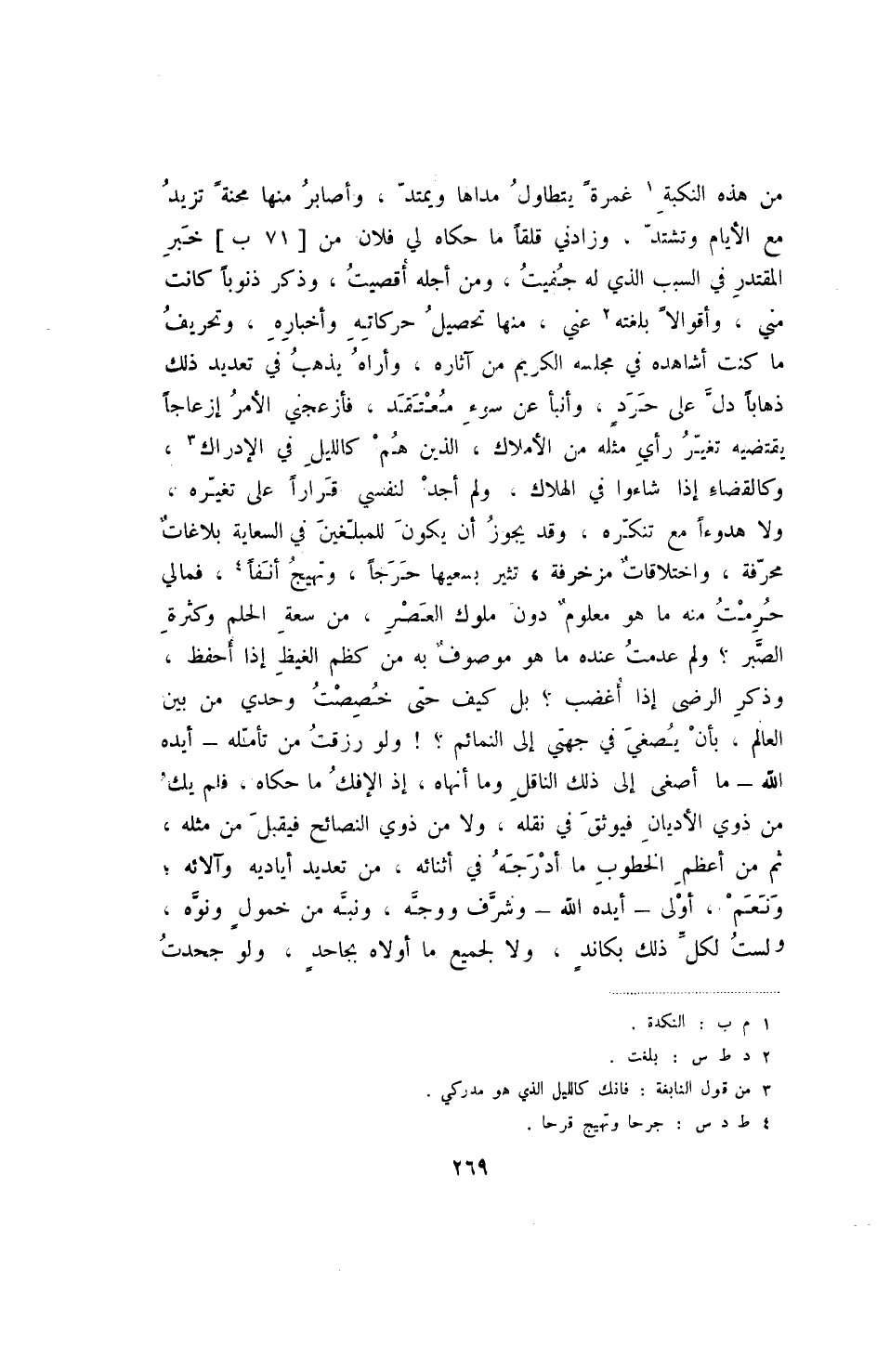 من هذه النكبة غمرة يتطاول مداها ويمتد، وأصبر منها محنة تزيد مع الأيام وتشتد، وزادني قلقا ما حكاه لي فلان من [71 ب] خبر المقتدر في السبب الذي له جفيت، من أجله أقصيت، وذكر ذنوبا كانت مني، وأقوالا بلغه عني، منها تحصيل حركاته وأخباره، وتحريف ما كنت أشاهده في مجلسه الكريم من آثاره، وأراه، يذهب في تعديد ذلك ذهابا دل على حرد، وأنبأ عن سوء معتقد، فأزعجني الأمر إزعاجا يقتضيه تغير رأي مثله من الأملاك، الذين هم كالليل في الإدراك، وكالقضاء إذا شاءوا في الهلاك، ولم أجد لنفسي قرارا على تغيره، ولا هدوءا مع تنكره، وقد يجوز أن يكون للمبلغين في السعاية بلاغات محرفة، واختلاقات مزخرفة، تثير بسعيها حرجا، وتهيج أنفا، فمالي حرمت منه ما هو معلوم دون ملوك العصر، من سعة الحلم وكثرة الصبر - ولم عدمت عنده ما هو موصوف به من كظم الغيظ إذا أحفظ، وذكر الرضى إذا أغضب - بل كيف حتى خصصت وحدي من بين العالم، بأن يصغي في جهتي إلى النائم -! ولو رزقت من تأمله - أيده الله - ما أصغى إلى ذلك الناقل وما أنهاه، إذ الإفك ما حكاه، فلم يك من ذوي الأديان فيوثق في نقله، ولا من ذوي النصائح فيقبل من مثله، ثم من أعظم الخطوب ما أدرجه في أثنائه، من تعديد أياديه وآلائه؛ ونعم، أولى - أيده الله - وشرف ووجه، ونبه من خمول ونوه، ولست لكل ذلك بكاند، ولا لجميع ما أولاه بحاحد، ولو جحدت