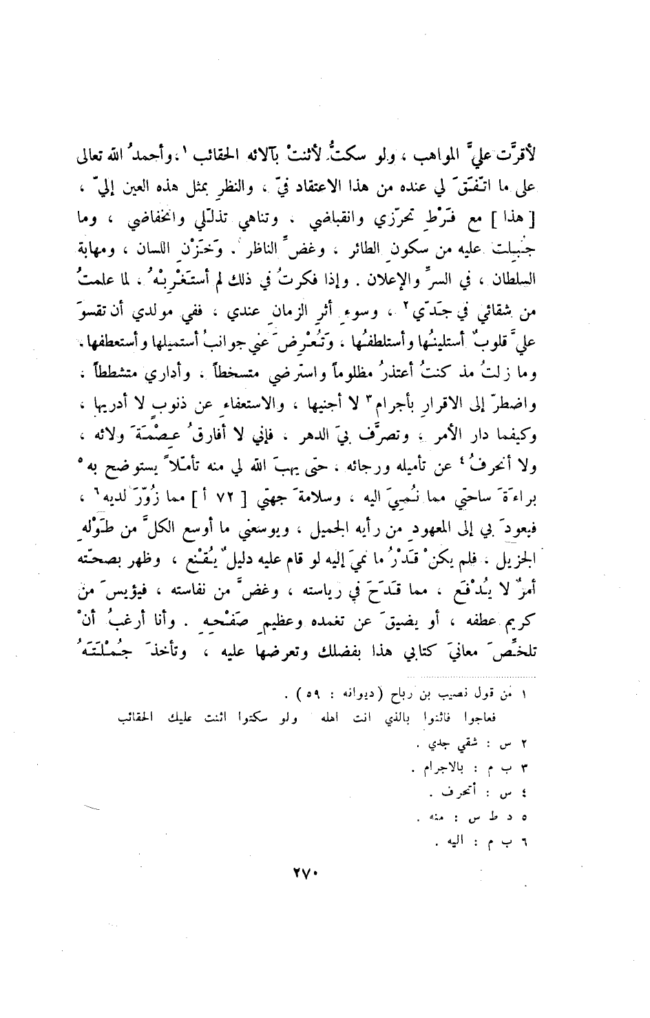 لأقرت علي المذاهب، ولو سكت لأثنت لآلائه الحقائب، واحمد الله تعالى على ما اتفق لي عنده من هذا الاعتقاد في، والنظر بمثل هذه العين إلي، [هذا] مع فرط تحرزي وانقباضي، وتناهي تذللي وانخفاضي، وما جبلت عليه من سكون الطائر، وغص الناظر، وخزن اللسان، ومهابة السلطان، في السر والإعلان. وإذا فكرت في ذلك لم أستغربه، لما علمت من شقائي في جدي، وسوء أثر الزمان عندي، ففي مولدي أن تقسو على قلوب أستلينها وأستلطفها، وتعرض عني جوانب أستميلها وأستعطفها، وما زلت مذ كنت أعتذر مظلوما واسترضي متسخطا، وأداري متشططا، واضطر إلى الاقرار بأجرام لا أجنيها، والاستعفاء عن ذنوب لا أدريها، وكيفما دار الأمر، وتصرف بي الدهر، فإني لا أفارق عصمة ولائه، ولا أنحرف عن تأميله ورجائه، حتى يهب الله لي منه تأملا يستوضح به براءة ساحتي مما نمي اليه، وسلامة جهتي [72 أ] مما زور لديه، فيعود بي إلى المعهود من رأيه الجميل، ويوسعني ما أوسع الكل من طوله الجزيل، فلم يكن قدر ما نمي إليه لو قام عليه دليل يقنع، وظهر بصحته أمر لا يدفع، مما قدح في رياسته، وغص من نفاسته، فيؤيس من كريم عطفه، أو يضيق عن تغمده وعظيم صفحه. وأنا أرغب أن تلخص معاني كتابي هذا بفضلك وتعرضها عليه، وتأخذ جملته