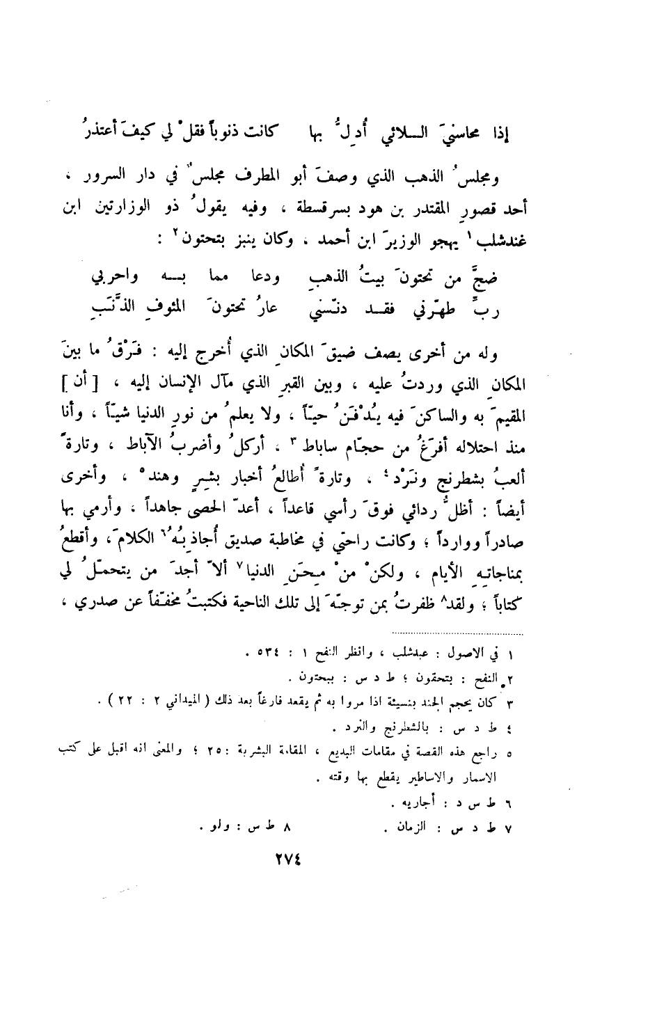 وله من أخرى يصف ضيق المكان الذي أخرج إليه: فرق ما بين المكان الذي وردت عليه، وبين القبر الذي مآل الإنسان إليه، [أن] المقيم به والساكن فيه يدفن حيا، ولا يعلم من نور الدنيا شيئا، وأنا منذ احتلاله أفرغ من حجام ساباط، أركل وأضرب الآباط، وتارة ألعب بشطرنج ونرد، وتارة أطالع أخبار بشر وهند، وأخرى أيضا: أظل ردائي فوق رأسي قاعدا، أعد الحصى جاهدا، وأرمي بها صادرا وواردا؛ وكانت راحتي في مخاطبة صديق أجاذبه الكلام، وأقطع بمناجاته الأيام، ولكن من محن الدنيا ألا أجد من يتحمل لي كتابا؛ ولقد ظفرت بمن توجه إلى تلك الناحية فكتبت مخففا عن صدري