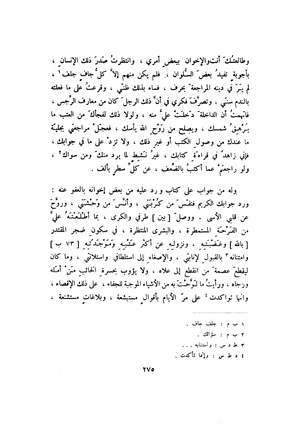 وطالعتك أنت والإخوان ببعض أمري، وانتظرت صدر ذلك الإنسان، بأجوبة تفيد بعض السلوان، فلم يكن منهم إلا كل جاف جلف، لم ير في دينه المراجعة بحرف، فساء بذلك ظني، وقرعت على ما فعلته بالندم سني، وتصرف فكري في أن ذلك الرجل كان من معارف الرجس، فاتهمت أن الداخلة دخلت علي منه، ولولا ذلك لفجأك من التعب ما يرهق شمسك، ويصلح من روح الله يأسك، فعجل مراجعتي بجلية ما عنك من وصول الكتب أو غير ذلك، ولا تزد على ما في جوابك، فإني زاهد في قراءة كتابك، غير نشط لما يرد منك ومن سواك، ولو راجعتم عما أكتب بالضعف، عن كل سطر بألف.