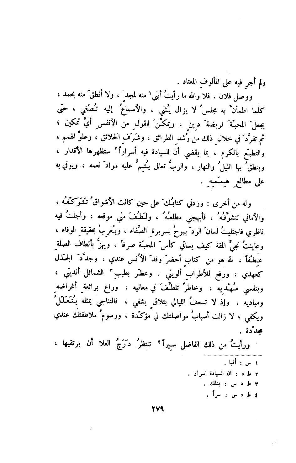 ووصل فلان، فلا والله ما رأيت أبنى منه لمجد، ولا أنطق منه بحمد، كلما اطمأن به مجلس لا يزال يثني، والأسماع إليه تصغي، حتى يجعل المحبة فريضة دين، ويمكن للقول من الأنفس أي تمكين، ثم تفرد في خلال ذلك من رشد الطرائق، وشرف الخلائق، وعلو الهمم، والتطبع بالكرم، بما يقضي أن للسيادة فيه أسرارا ستظهرها الأقدار، وينطق بها الليل والنهار، والرب تعالى يتم عليه يتم عليه مواد نعمه، ويوفي به على مطالع هممه.