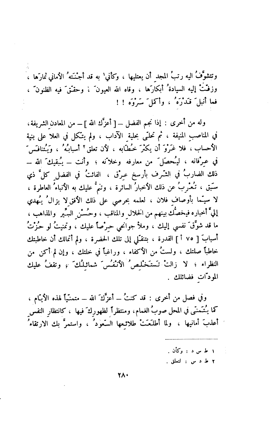 وفي فصل من أخرى: قد كنت - أعزك الله - متمنيا لهذه الأيام، كما يتمنى في المحل صوب الغمام، ومنتظرا لظهورك فيها، كانتظار النفس أعذب أمانيها، ولما أطلعت طلائعها السعود، واستمر بك الارتقاء