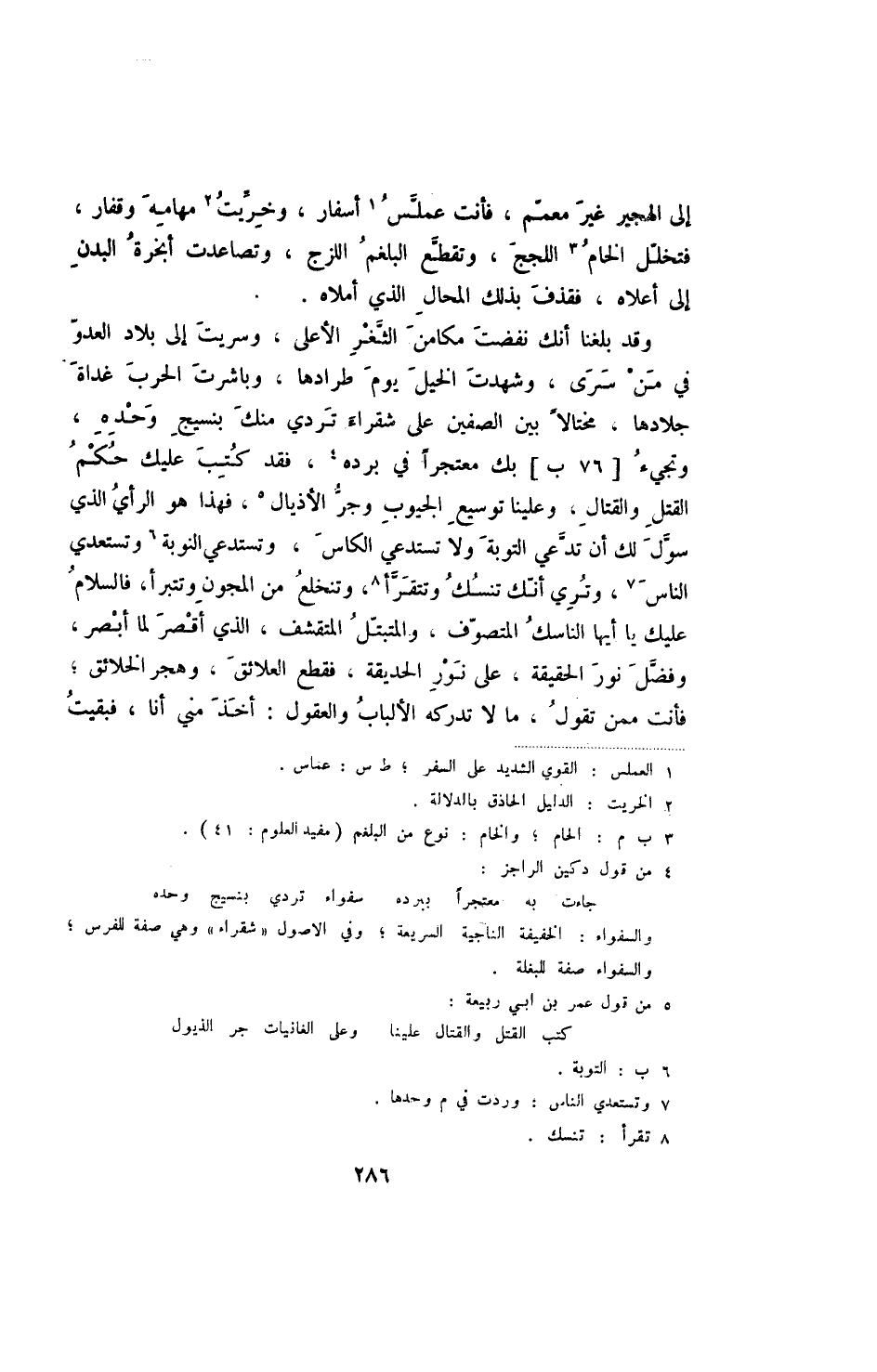 وقد بلغنا نفضت مكامن الثغر الأعلى، وسربت إلى بلاد العدو في من سرى، وشهدت الخيل يوم طرادها، وباشرت الحرب غداة جلادها، مختالا بين الصفين على شقراء تردي منك بنسيج وحده، وتجيء [76 ب] بك معتجزا في برده، فقد كتب عليك حكم القتل والقتال، وعلينا توسيع الجيوب وجر الأذيال، فهذا هو الرأي الذي سول لك أن تدعي التوبة ولا تستدعي الكاس، وتستدعي النوبة وتستعدي الناس، وتري أنك تنسك وتتقرأ، وتنخلع من المجون وتتبرأ، فالسلام عليك يا أيها الناسك المتصوف، والمتبل المتقشف، الذي أقصر لما أبصر، وفضل نور الحقيقة، على نور الحديقة، فقطع العلائق، وهجر الخلائق؛ فأنت ممن تقول، ما لا تدركه الألباب والعقول: أخذ مني أنا، فبقيت