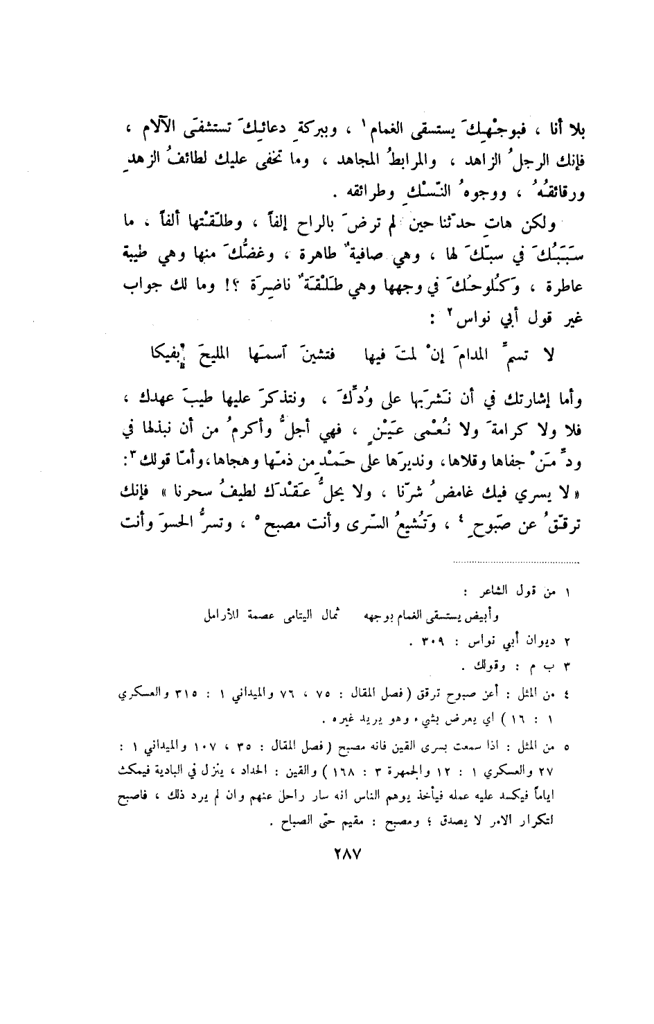 وأما إشارتك في أن نشربها على ودك، ونتذكر عليها طيب عهدك، فلا ولا كرامة ولا نعمى عين، فهي أجل وأكرم من أن نبذلها في ود من جفاها وقلاها، ونديرها على حمد من ذمها وهجاها، وأما قولك: " لا يسري فيك غامض شرنا، ولا يحل عقدك لطيف سحرنا " فإنك ترقق عن صبوح، وتشيع السرى وأنت مصبح، وتسر الحسو وأنت