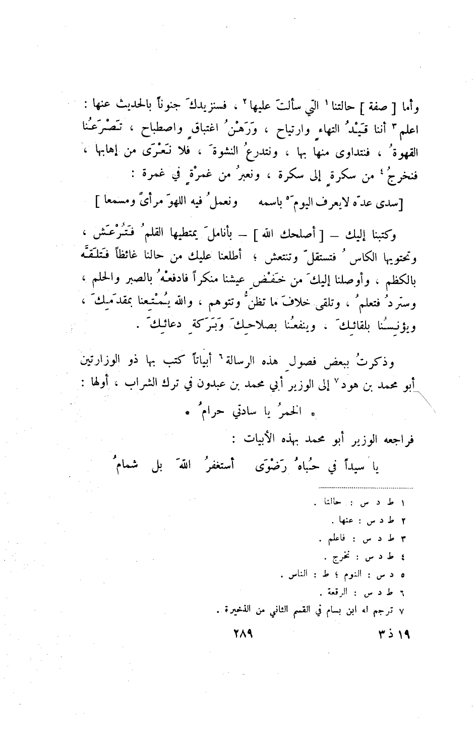 وذكرت ببعض فصول هذه الرسالة أبياتا كتب بها ذو الوزارتين أبو محمد بن هود إلى الوزير أبي محمد بن عبدون في ترك الشراب، أولها: