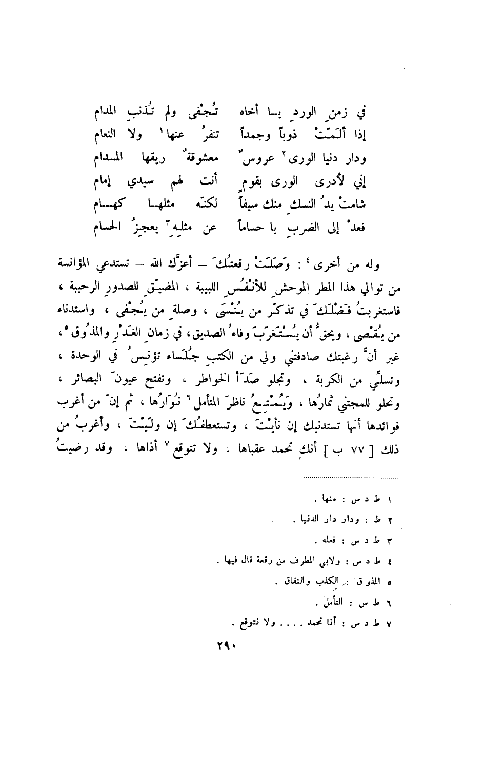 وله من أخرى: وصلت رقعتك - أعزك الله - تستدعي المؤانسة من توالي هذا المطر الموحش للأنفس اللبيبة، المضيق للصدور الرحيبة، فاستغرقت فضلك في تذكر من ينسى، وصلة من يجفى، واستدناء من يقصى، ويحق أن يستغرب وفاء الصديق، في زمان الغدر والمذوق، غير أن رغبتك صادفتني ولي من الكتب جلساء تؤنس في الوحدة، وتسلي من الكربة، وتجلو صدأ الخواطر، وتفتح عيون البصائر، وتحلو للمجتني ثمارها، ويتمتع ناظر المتأمل نوارها، ثم إن من أغرب فوائدها أنها تستدنيك إن نأيت، وتستعطفك إن وليت، وأغرب من ذلك [77 ب] أنك تحمد عقباها، ولا تتوقع أذاها، وقد رضيت