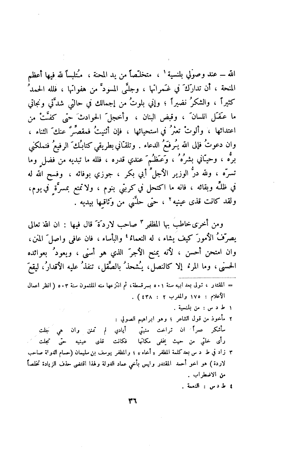 ومن أخرى خاطب بها المظفر صاحب لاردة قال فيها: أن الله تعالى يصرف الأمور كيف يشاء، له النعماء والبأساء، فإن عافى واصل المنن، وأن امتحن أحسن، لأنه يمنح الأجر الذي هو أسنى، ويعود بعوائده الحسنى، وما المرء إلا كالنصل، يشحذ بالصقل، تنفذ عليه الأقدار، ليقع