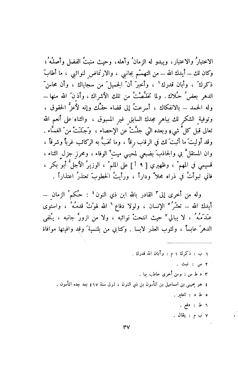 وله من أخرى إلى القادر بالله ابن ذي النون: حكم الزمان - أيدك الله - تعثر الإنسان، ولولا دفاع الله لهوت قدمه، واستوى عدمه، لا يبالي حيث انتحت نوائبه، ولا من ازور جانبه، يلفى الدهر عابسا، ولثوب العذر لابسا. وكتابي من بلنسية وقد وافيتها موافاة