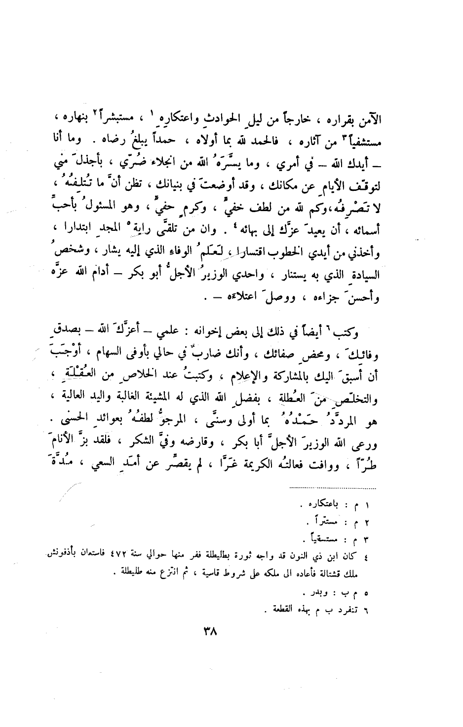 الآمن بقراره، خارجا من ليل الحوادث واعتكاره، مستبشرا بنهاره، مستشفيا من آثاره، فالحمد لله بما أولاه، حمدا يبلغ رضاه. وما أنا - أيدك الله - في أمري، وما يسره الله من انجلاء ضري، بأجذل مني لتوقف الأيام عن مكانك، وقد أوضعت في بنيانك، تظن أن ما تتلفه، لا تصرفه، وكم لله من لطف خفي، وكرم حفي، وهو المسئول بأحب أسمائه، أن يعيد عزك إلى بهائه. وأن من تلقى راية المجد ابتدارا، وأخذني من أيدي الخطوب اقتسارا، لعلم الوفاء الذي إليه يشار، وشخص السيادة الذي به يستنار، واحدي الوزير الأجل أبو بكر - أدام الله عزه وأحسن جزاءه، ووصل اعتلاءه -.
