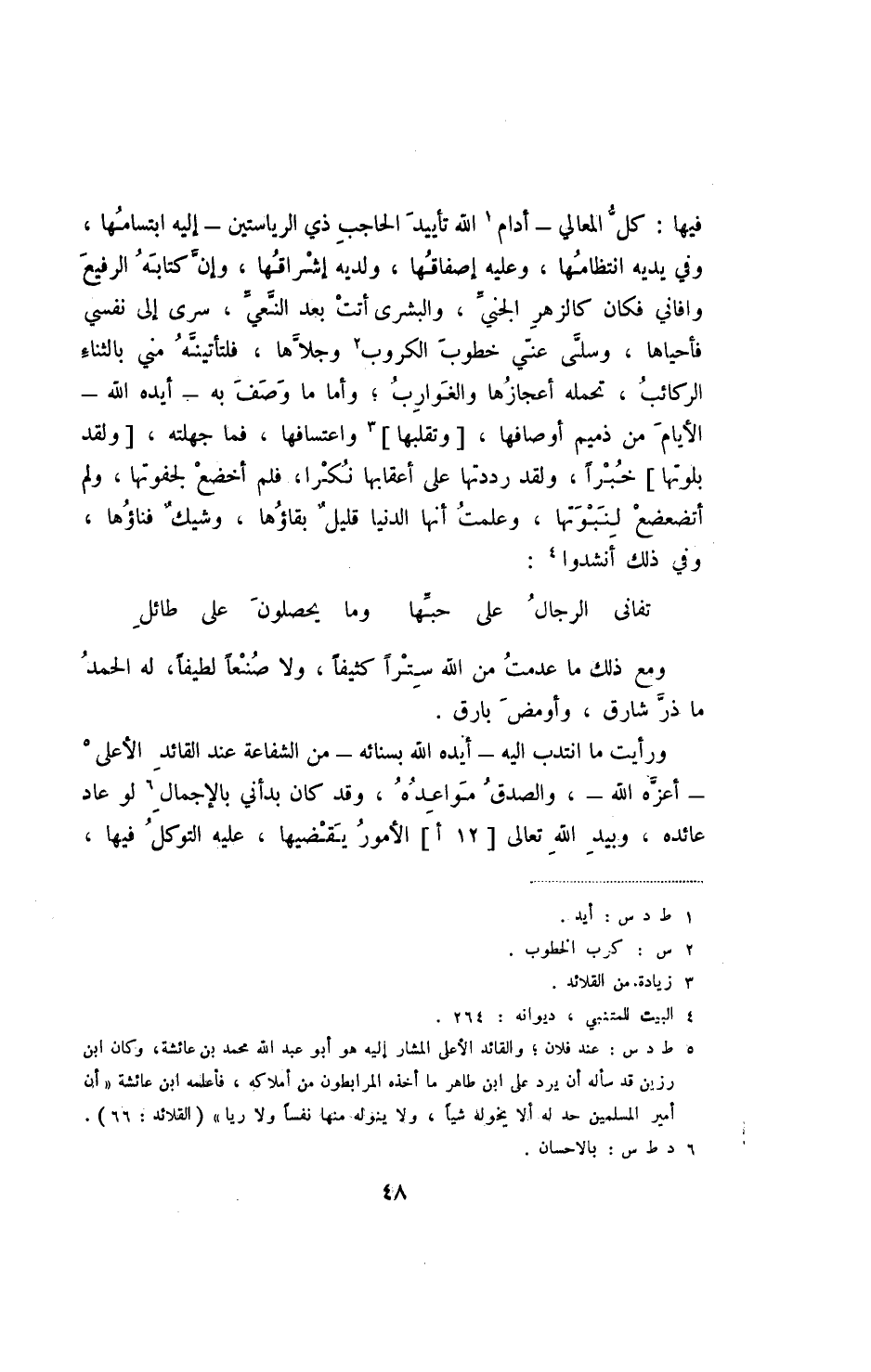 فيها: كل المعالي - أدام الله تأييد الحاجب ذي الرياستين - إليه ابتسامها، وفي يديه انتظامها، وعليه إصفاقها، ولديه إشراقها، وإن كتابه الرفيع وافاني فكان كالزهر الجني، والبشرى أتت بعد النعي، سرى إلى نفسي فأحياها، وسلى عني خطوب الكروب وجلاها، فلتأتينه مني بالثناء الركائب، تحمله أعجازها والغوارب؛ وأما ما وصف به - أيده الله - الأيام من ذميم خبرا، ولقد رددتها على أعقابها نكرا، فلم أخضع لجفوتها، ولم أتضعضع لنبوتها، وعلمت أنها الدنيا قليل بقاؤها، وشيك فناؤها، وفي ذلك أنشدوا: