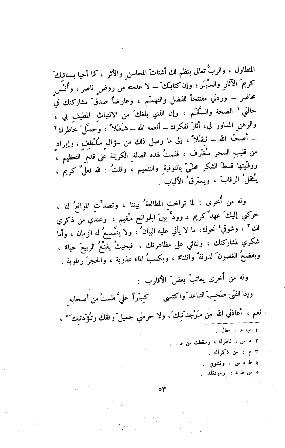 وله من أخرى: لما تراخت المطالعة بيننا، وتصدت الموانع لنا، حركني إليك عهد كريم، وود بين الجوانح مقيم، وعندي من ذكري لك، وشوقي نحوك، ما لا يأتي عليه البيان، ولا يتسع له الزمان، وأما شكري لمشاركتك، وثنائي على مظاهرتك، فبحيث يقنع الربيع حياء، ويفضح الغصون لدونة وانثناء، ويكسب الماء عذوبة، والحجر رطوبة.