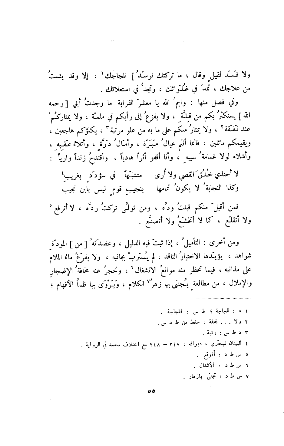 وفي فصل منها: وايم الله يا معشر القرابة ما وجدت أبي [رحمه الله] يستكثر بكم من قلة، ولا يفزع إلى رأيكم في ملمة، ولا يمتاركم عند نفقة، ولا يمتاز منكم على ما به من علو مرتبة، يكلؤكم هاجعين، ويقيمكم مائلين، فإنما أنتم عيال مبرة، وأمال درة، وأتلاء عقبة، وأشلاء لولا غمامة سيبه، وأنا أقفو أثرا هاديا، وأقتدح زندا واريا: