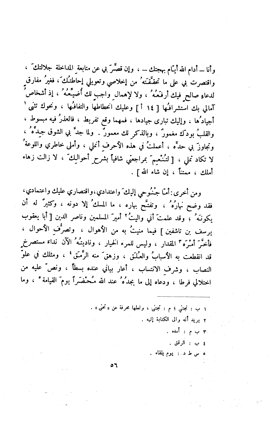 وأنا - أدام الله أيام بهجتك -، وإن قصر بي عن متابعة المداخلة جلالتك، واقتصرت بي على ما تحققته من إخلاصي وتعويلي إحاطتك، فغير مفارق لدعاء صالح أرفعه، ولا لإهمال واجب لك أضيعه، إذ أشخاص آمالي بك استشرافها [14أ] وعليك انحطاطها والتفافها، ونحوك تثنى أجيادها، وإليك تبارى جيادها، فمهما وقع تفريط، فالعذر فيه مبسوط، والقلب بودك مغمور، وبالذكر لك معمور، ولما جد بي الشوق جده، وتجاوز بي حده، أعلمت في هذه الأحرف أنملي، وأملى خاطري واللوعة لا تكاد تملي، [لتنعم بمراجعتي شافيا بشرح أحوالك، لا زالت زهاء أملك، ممتنا، إن شاء الله] .