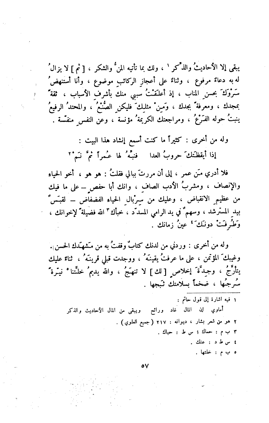 يبقى إلا الأحاديث والذكر، ولك بما تأتيه المن والشكر، [ثم] لا يزال له به دعاء مرفوع، وثناء على أعجاز الركائب موضوع، وأنا أستنهض سروك بحسن المناب، إذ أعلقت سبي منك بأشرف الأسباب، ثقة بمجدك، ومعرفة بجدك، ومن مثلك فليكن الصنع، والمحتد الرفيع ينبت حوله الفزع، ومراجعتك الكريمة مؤنسة، وعن النفس منفسة.