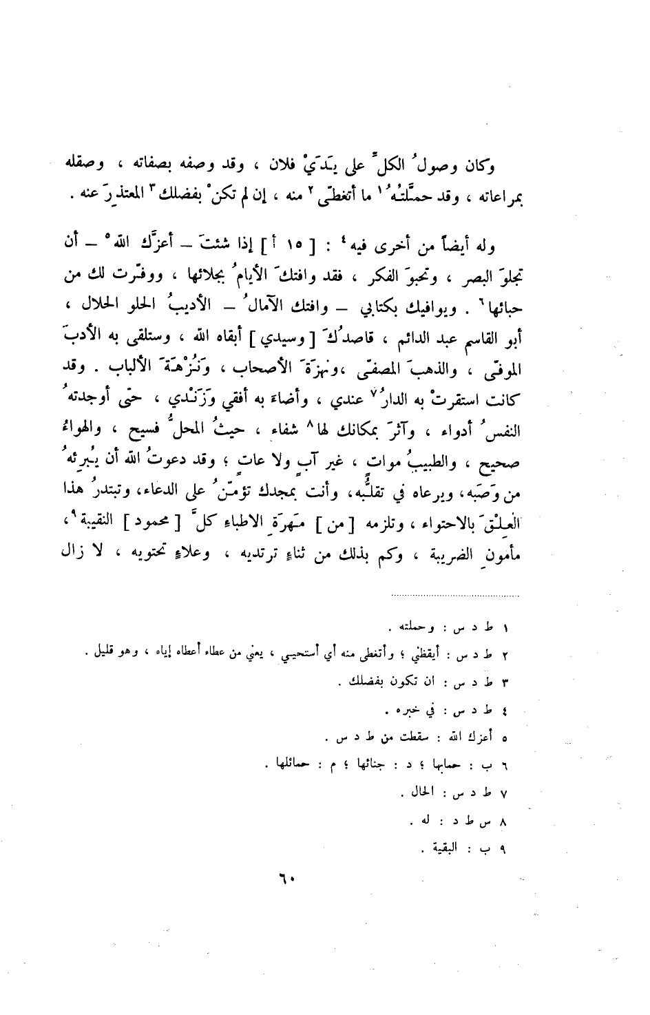 وله أيضا من أخرى فيه: [15أ] إذا شئت - أعزك الله - أن تجلو البصر، وتحبو الفكر، فقد وافتك الأيام بجلائها، ووفرت لك من حبائها. ويوافيك بكتابي - وافتك الآمال - الأديب الحلو الحلال، أبو القاسم عبد الدائم، قاصدك [وسيدي] أبقاه الله، وستلقى به الأدب الموفى، والذهب المصفى، ونهزة الأصحاب، ونزهة الألباب. وقد كانت استقرت به الدار عندي، وأضاء به أفقي وزندي، حتى أوجدته النفس أدواء، وآثر لمكانك لها شفاء، حيث المحل فسيح، والهواء صحيح، والطبيب موات، غير آب ولا عات؛ وقد دعوت الله أن يبرئه من وصبه، ويرعاه في تقلبه، وأنت بمجدك تؤمن على الدعاء، وتبتدر هذا العلق بالاحتواء، وتلزمه [من] مهرة الاطباء كل [محمود] النقيبة، مأمون الضريبة، وكم بذلك من ثناء ترتديه، وعلاء تحتويه، لا زال