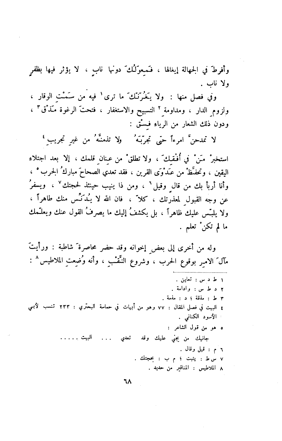 استخبر من في أفقك، ولا تطلق من عنان قلمك، إلا بعد اجتلاء اليقين، وتحفظ من عدوى القرين، فقد تعدي الصحاح مبارك الجرب، وأنا أربأ بك من قال وقيل، ومن ذا ينيب حينئذ لحجتك، ويسفر عن وجه القبول لمعذرتك، كلا، فان الله لا يدنس منك طاهرا، ولا يلبس عليك ظاهرا، بل يكشف إليك ما يصرف القول عنك ويعلمك ما لم تكن تعلم.