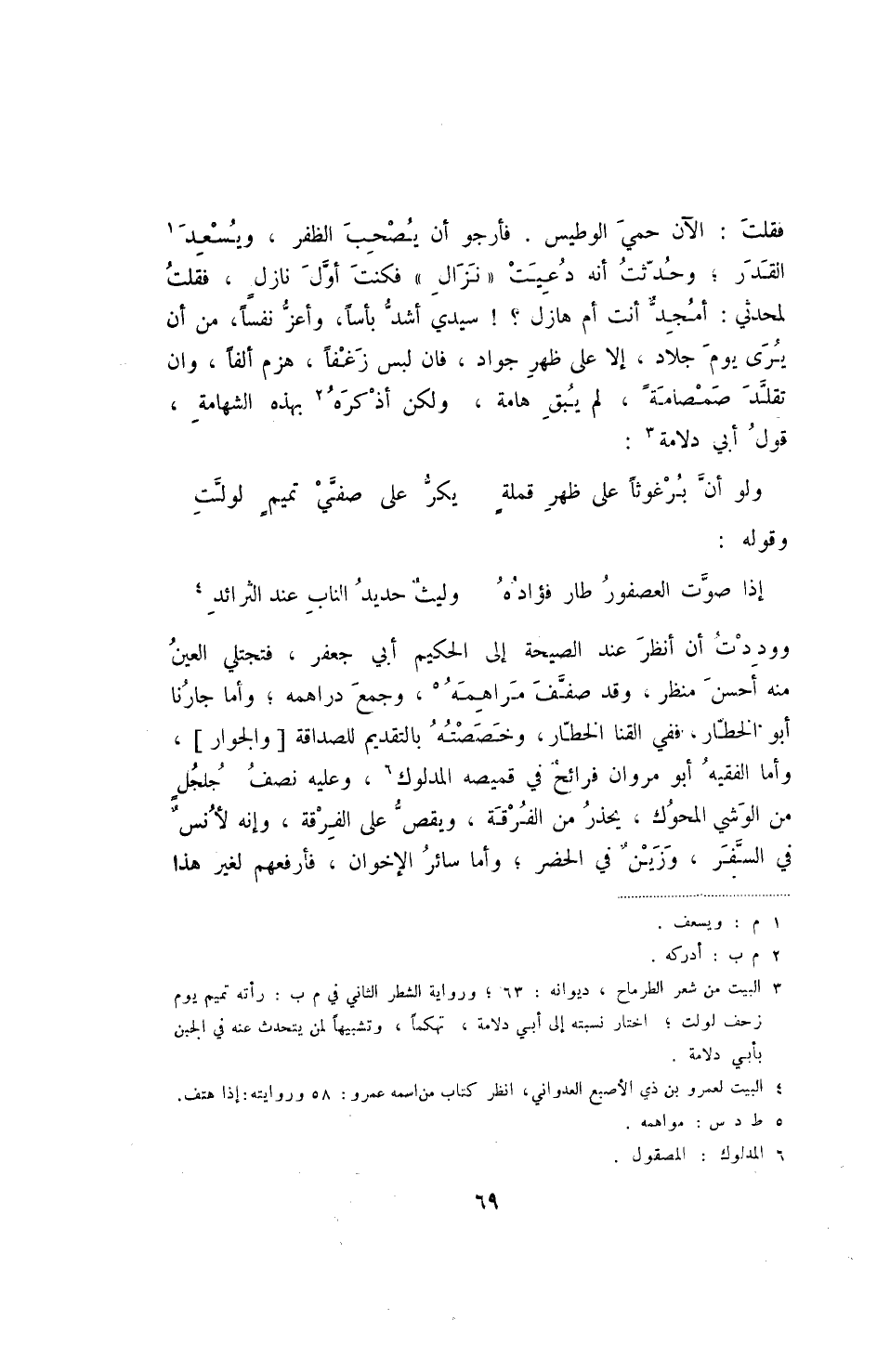 فقلت: الآن حمي الوطيس. فأرجو أن يصحب الظفر، ويسعد القدر؛ وحدثت أنه دعيت " نزال " فكنت أول نازل، فقلت لمحدثي: أمجد أنت أم هازل -! سيدي أشد بأسا، وأعز نفسا، من أن يرى يوم جلاد، إلا على ظهر جواد، فان لبس زغفا، هزم ألفا، وان تقلد صمصامة، لم يبق هامة. ولكن أذكره بهذه الشهامة، قول أبي دلامة: