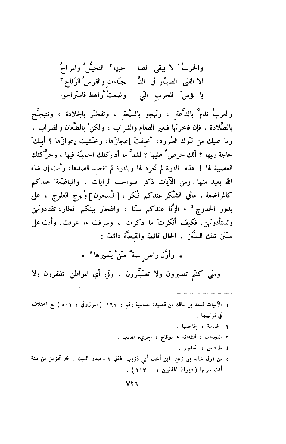 يا بؤس للحرب التي ... وضعت أراهط فاستراحوا والعرب تذم بالدعة، وتهجو بالسعة، وتفخر بالجلادة، وتتبجح بالصلادة، فإن فاخرتها فبغير الطعام والشراب، ولكن بالطعان والضراب، وما عليك من لوك العرود، أخفت إعجازها، وخشيت إعوازها - أبك حاجة إليها - ألك حرص عليها - لشد ما أدركتك الحمية فيها، وحركتك العصبية لها! هذه نادرة لم تحرد لها وبادرة لم تقصد قصدها، وأنت إن شاء الله بعيد منها. ومن الآيات ذكر صواحب الرايات، والمباضعة عندكم كالمراضعة، مافي الشكر عندكم نكر، [تبيحون] ولوج العلوج، على بدور الحدوج؛ الزنا عندكم سنا، والفجار بينكم فخار، تقتادونهن وتستأدونهن، فكيف أنكرت ما ذكرت، وسرفت ما عرفت، وأنت على سنن تلك السنن، الحال قائمة والقصة دائمة: