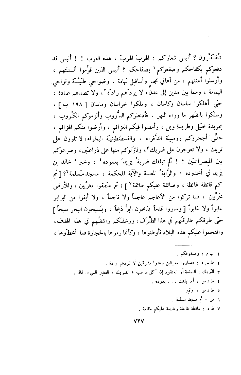 تظفرون - أليس شعاركم: الهرب الهرب، هذه العرب!! ألبس قد دفعوكم بكفاحكم وصفعوكم بصفاحكم - أليس الذين قوموا ألسنتهم، وأرسلوا أعنتهم، من أعالي نجد وأسافل تهامة، وضواحي طيبة ونواحي اليمامة، ومما بين مدين إلى عدن، لا يردهم رادة، ولا تصدهم صادة، حتى أهلكوا ساسان وكاسان، وملكوا خراسان وماسان [198ب] ، وسلكوا بالقهر ما وراء النهر، فأدخلوكم الدروب وألزموكم الكروب، بجريدة خيل وطريدة ويل، وأمضوا فيكم العزائم، وأرضوا منكم الهزائم، حتى أجحروكم رومية الدفراء، والقسطنطينية البخراء، لا تلوون على تريك، ولا تعرجون على ضريك، ونازلوكم منها على دراعين، وصرعوكم بين المصراعين -! ألم تبلغك ضربة يزيد بعموده