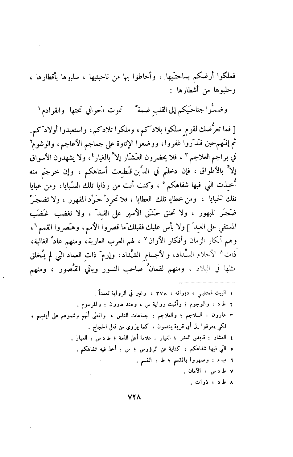 [فما تعرضك لقوم سلكوا بلادكم، وملكوا تلادكم، واستعبدوا أولادكم. ثم إنهم حين قدروا غفروا، ووضعوا الإتاوة على جماجم الأعاجم، والوشوم في براجم العلاجم، فلا يحضرون العشار إلا بالغيار، ولا يشهدون الأسواق إلا بالأطواق، فإن دخلتم في الدين قطعت أستاهكم، وإن خرجتم منه أخذت التي فيها شفاهكم، وكنت أنت من رذايا تلك السبايا، ومن عبايا تلك الخبايا، ومن خطايا تلك العطايا، فلا تحرد حرد المقهور، ولا تضجر ضجر المبهور، ولا تحنق الأسير على القد، ولا تغضب المستقي على العد] ولا بأس عليك فقبلك ما قصروا الأمم، وهصروا القمم، وهم أبكار الزمان وأفكار الأوان، لهم العرب العاربة، ومنهم عاد الغالبة، ذات الأحلام السداد، والأجسام الشداد، وإرم ذات العماد التي لم يخلق مثلها في البلاد، ومنهم لقمان صاحب النسور وباني القصور، ومنهم