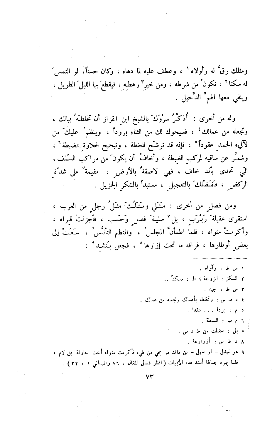 ومن فصل من أخرى: مثلي ومثلك مثل رجل من العرب، استقرى عقيلة ربرب، بل سليلة فصل وحسب، فأجزلت قراه، وأكرمت مثواه، فلما اطمأن المجلس، وانتظم التأنس، سعت إلى بعض أوطارها، فراقه ما تحت إزارها، فجعل ينشد:
