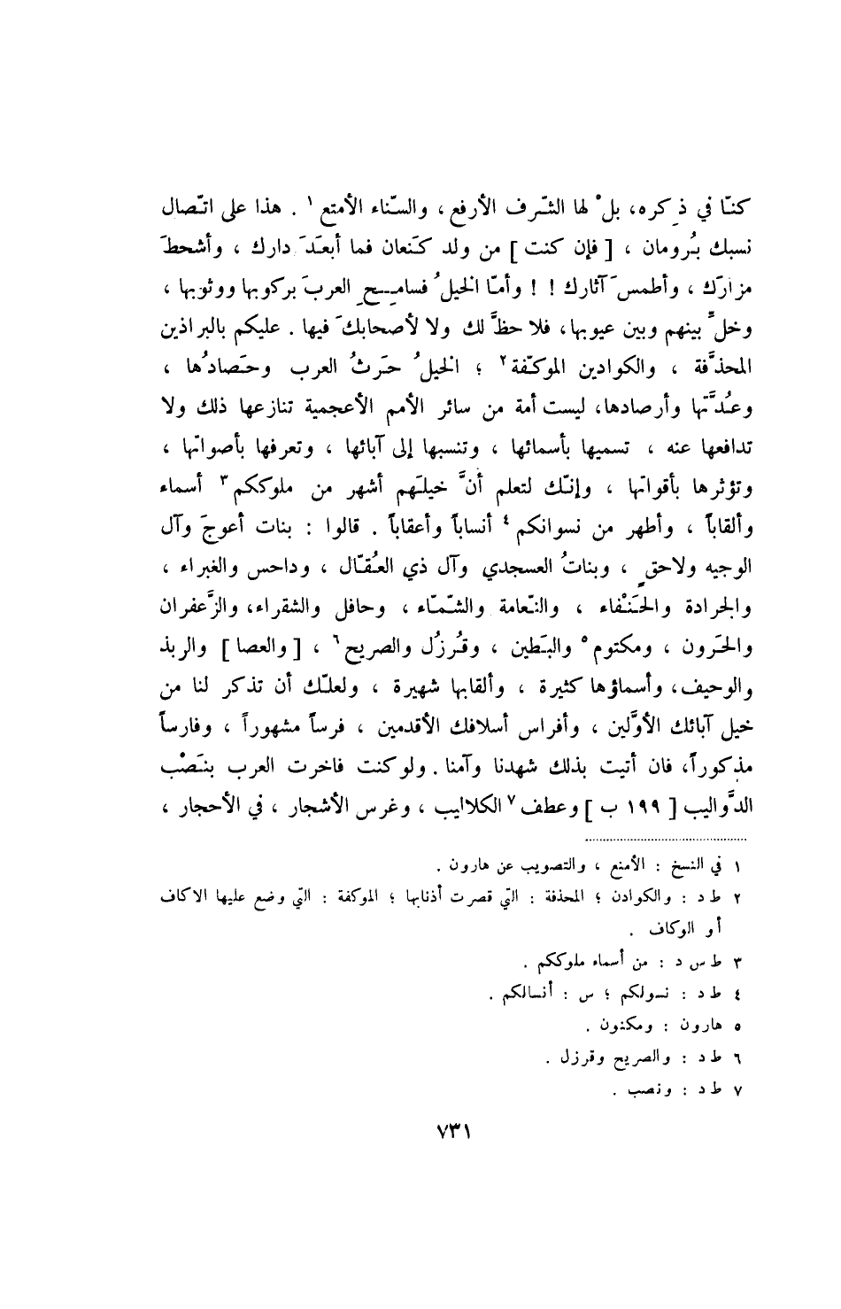 كنا في ذكره، بل لها الشرف الأرفع، والسناء الأمتع. هذا على اتصال نسبك برومان، [فإن كنت] من ولد كنعان فما أبعد دارك، وأشحط مزارك، وأطمس آثارك!! وأما الخيل فسامح العرب بركوبها ووثوبها، وخل بينهم وبين عيوبها، فلا حظ لك ولا لأصحابك فيها. عليكم بالبراذين المحذفة، والكوادين الموكفة؛ الخيل حرث العرب وحصادها، وعدتها وأرصادها، ليست أمة من سائر الأمم الأعجمية تنازعها ذلك ولا تدافعها عنه، تسميها بأسمائها، وتنسبها إلى آبائها، وتعرفها بأصواتها، وتؤثرها بأقواتهان وإنك لتعلم أن خيلهم أشهر من ملوككم أسماء وألقابا، وأطهر من نسوانكم أنسابا وأعقابا. قالوا: بنات أعوج وآل الوجيه ولاحق، وبنات العسجدي وآل ذي العقال، وداحس والغبراء، والجرادة والخنفاء، والنعامة والشماء، وحافل والشقراء، والزعفران والحرون، ومكتوم والبطين، وقرزل والصريح، [والعصا] والربد والوحيف، وأسماؤها كثيرة، وألقابها شهيرة، ولعلك أن تذكر لنا من خيل آبائك الأولين، وأفراس أسلافك الأقدمين، فرسا مشهورا، وفارسا مذكورا، فان أتيت بذلك شهدنا وآمنا. ولو كنت فاخرت العرب بنصب الدواليب [199ب] وعطف الكلاليب، وغرس الأشجار، في الأحجار