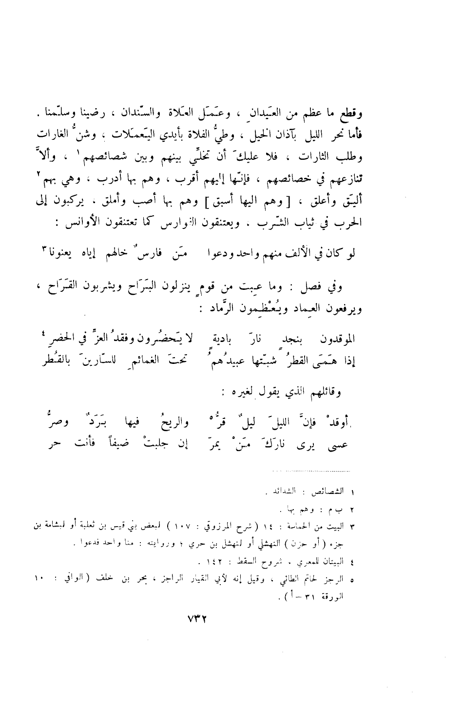 وقطع ما عظم من العيدان، وعمل العلاة والسندان، رضينا وسلمنا. فأما نر الليل بآذان الخيل، وطي الفلاة بأيدي اليعملات، وشن الغارات وطلب الثارات، فلا عليك أن تخلي بينهم وبين شصائصهم، وألا تنازعهم في خصائصهم، فإنما إليهم أقرب، وهم بها أدرب، وهي بهم أليق وأعلق، [وهم اليها أسبق] وهم بها أصب وأملق، يركبون إلى الحرب في ثياب الشرب، ويعتنقون الفوارس كما تعتنقون الأوانس: