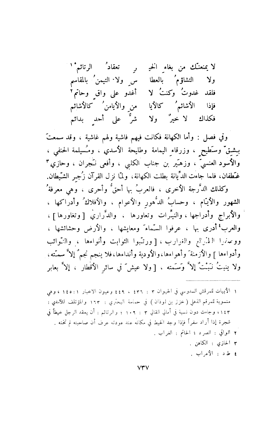 فكذاك لا خير ولا ... شر على أحد بدائم وفي فصل: وأما الكهانة فكانت فيهم فاشية ولهم غاشية، وقد سمعت بشق وسطيح، وزرقاء اليمامة وطليحة الأسدي، ومسيلمة الحنفي، والأسود العنسي، وزهير بن جناب الكلي، وأفعى نجران، وحازي غطفان، فلما جاءت الديانة بطلت الكهانة، ولما نزل القرآن زجر الشيطان.