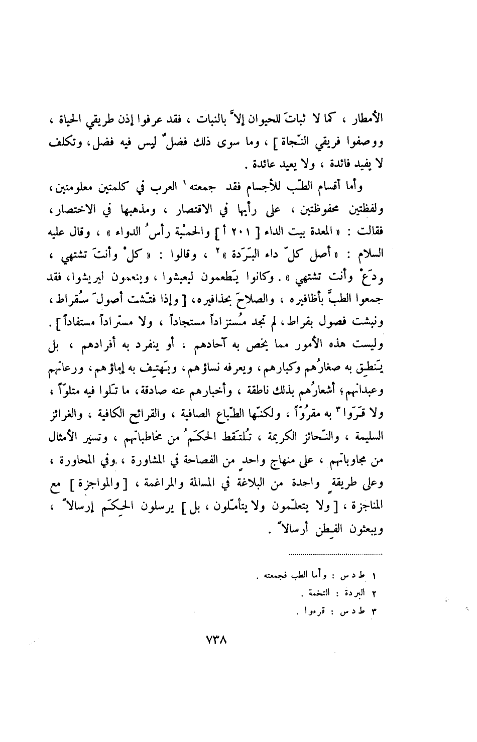 وأما أقسام الطب للأجسام فقد جمعته العرب في كلمتين معلومتين، ولفظتين محفوظتين، على رأيها في الاقتصار، وذهبها في الاختصار، فقالت: " المعدة بيت الداء [201أ] والحمية رأس الدواء "، وقال عليه السلام: " أصل كل داء البردة "، وقالوا: " كل وأنت تشتهي، ودع وأنت تشتهي ". وكانوا يطعمون ليعيشوا، وينعمون ليريشوا، فقد جمعوا الطب بأظافيره، والصلاح بحذافيره، [وإذا فتشت أصول سقراط، ونبشت فصول بقراط، لم تجد مستزادامستجادا، ولا مسترادا مستفادا [. وليست هذه الأمور مما يخص به آحادهم، أو ينفرد به أفرادهم، بل ينطق به صغارهم وكبارهم، ويعرفه نساؤهم، ويهتف به إماؤهم، ورعايهم وعبدانهم؛ أشعارهم بذلك ناطقة، وأخبارهم عنه صادقة، وأخبارهم عنه صادقة، ما تلوا فيه متلوا، ولا قروا به مقروا، ولكنها الطباع الصافية، والقرائح الكافية، والغرائز السليمة، والنحائز الكريمة، تلقط الحكم من مخاطباتهم، وتسير الأمثال من مجاوباتهم، على منهاج واحد من الفصاحة في المشاورة، وفي المحاورة، وعلى طريقة واحدة من البلاغة في المسالمة والمراغمة، [والمواجزة] مع المناجزة، [ولا يتعلمون ولا يتأملون، بل] يرسلون الحكم إرسالا، ويبعثون الفطن أرسالا.