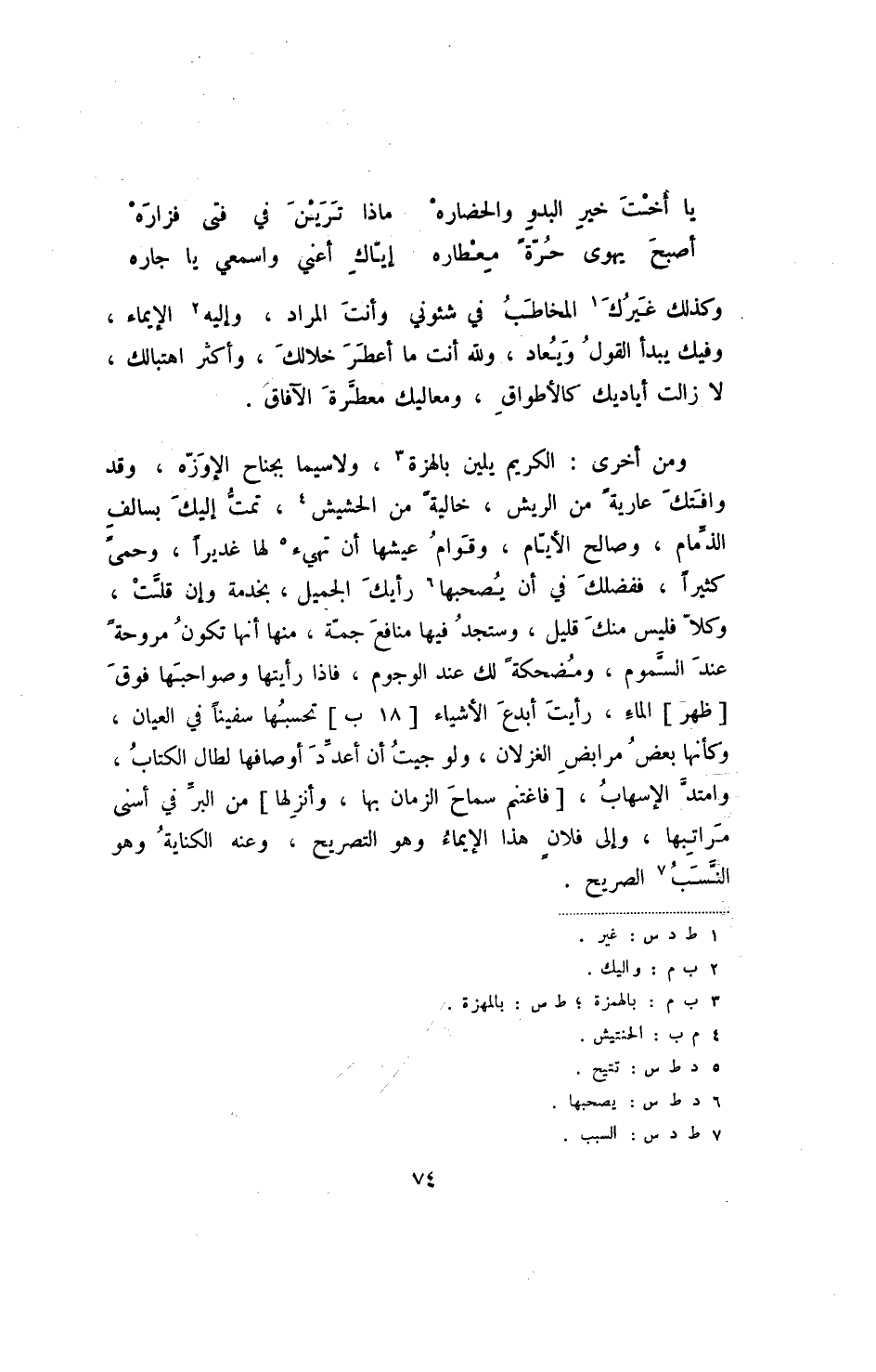 ومن أخرى: الكريم يلين بالهزة، ولا سيما بجناح الإوزة، وقد وافتك عارية من الريش، خالية من الحشيش، تمت إليك بسالف الذمام، وصالح الأيام، وقوام عيشها أن تهيء لها غديرا، وحمى كثيرا، ففضلك في أن يصحبها رأيك الجميل، بخدمة وإن قلت، وكلا فليس منك قليل، وستجد فيها منافع جمة، منها أنها تكون مروحة عند السموم، ومضحكة لك عند الوجوم، فاذا رأيتها وصواحبها فوق [ظهر] الماء، رأيت أبدع الأشياء [18ب] تحسبها سفينا في العيان، وكأنها بعض مرابض الغزلان، ولو جيت أن أعداد أوصافها لطال الكتاب، وامتد الإسهاب، [فاغتنم سماح الزمان بها، وأنزلها] من البر في أسنى مراتبها، وإلى فلان هذا الإيماء وهو التصريح، وعنه الكناية وهو النسب الصريح.
