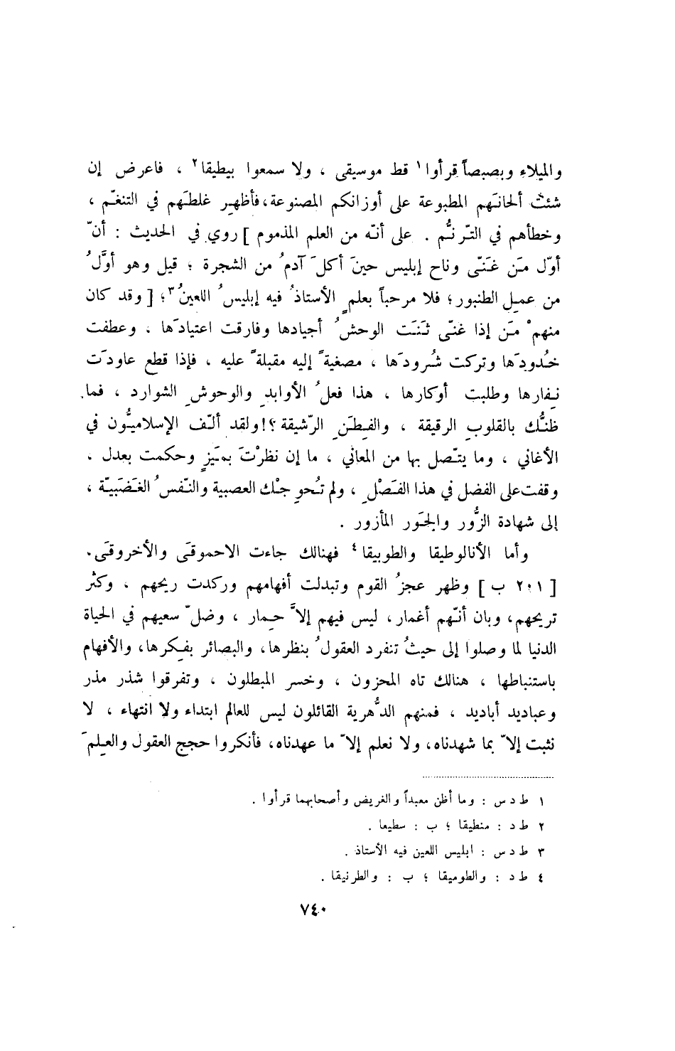 والميلاء وبصبصا قرأوا قط موسيقى، ولا سمعوا بيطيقا، فاعرض إن شئت ألحانهم المطبوعة على أورانكم المصنوعة، فأظهر غلطهم في التنغم، وخطأهم في الترنم. على أنه من العلم المذموم] روي في الحديث: أن أول من غنى وناح إبليس حين أكل آدم من الشجرة؛ قيل وهوأول من عمل الطنبور؛ فلا مرحبا بعلم الأستاذ فيه إبليس اللعين، [وقد كان منهم من إذا غنى ثنت الوحش أجيادها وفارقت اعتيادها، وعطفت خدودها وتركت شرودها، مصغية إليه مقبلة عليه، فإذا قطع عاودت نفارها وطلبت أوكارها، هذا فعل الأوابد والوحوش الشوارد، فما ظنك بالقلوب الرقيقة، والفطن الرشيقة -! ولقد ألف الإسلاميون في الأغاني، وما يتصل بها من المعاني، ما إن نظرت بميز وحكمت بعدل، وقفت على الفضل في هذا الفصل، ولم تحو جك العصبية والنفس الغضبية، إلى شهادة الزور والجور المأزور.