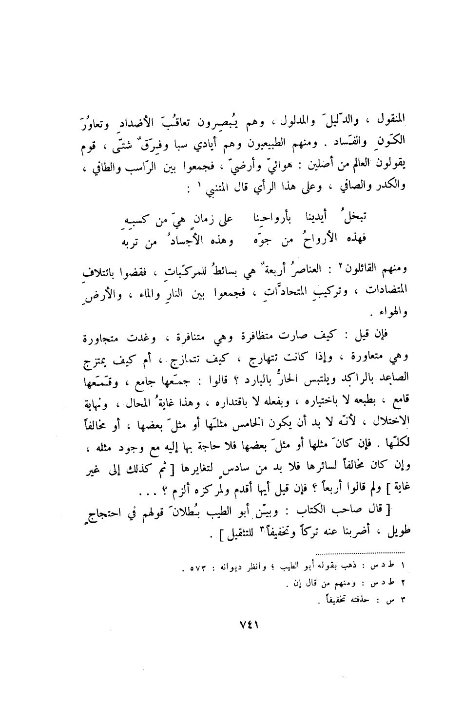 المنقول، والدليل والمدلول، وهم يبصرون تعاقب الأضداد وتعاور الكون والفساد. ومنهم الطبيعيون وهو أيادي سبا وفرق شتى، قوم يقولون العالم من أصلين: هوائي وأرضي، فجمعوا بين الراسب والطافي، والكدر والصافي، وعلى هذا الرأي قال المتنبي: