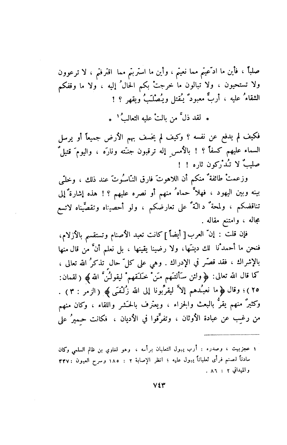 وزعمت طائفة منكم أن اللاهوت فارق الناسوت عند ذلك، وخلى بينه وبين اليهود، فهلا حماه منهم أو نصره عليكم -! هذه إشارة إلى تناقضكم، ولمحة دالة على تعارضكم، ولو أحصيناه وتقصيناه لاتسع مجاله، وامتنع مقاله.