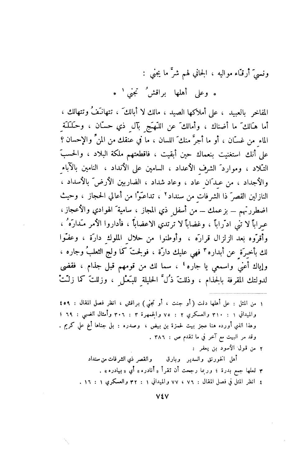 المفاخر بالعبيد، على أملاكها الصيد، مالك لا أبالك، تتهانف وتتهالك، أما هالك ما أضناك، وأمالك عن اللهج بآل ذي حسان، وحللة الماء من غسان، أو ما أجر منك اللسان، ما في عنقك من المن والإحسان - على أنك استغنيت بنعماك حين أبقيت، فاقطعتهم ملكة البلاد، والحسب التلاد، وموارد الشرف الأعداء، السامين على الأنداد، النامين بالآباء والأجداد، من عدان عاد، وعاد شداد، الضاربين الأرض بالأسداد، النازلين القصر ذا الشرفات من سنداد، تداعوا من أعالي الحجاز، وحيث اضطررتهم - بزعمك - من أسفل ذي الحجاز، سامية الهوادي والأعجازن عرابا لا تني ادرابا، وغضابا لا ترتدي الاعضابا، فأراداوا الأمر مدارهن وأقروه بعد الزلزال قراره، وأوطنوا من حلال الملوك دارة، وعفوا لك بأخرة عن أبداره فهي عليك دارة، فولجت كما ولج الثعلب وجاره، وإياك أعني واسمعي يا جاره، سما لك من قومهم قبل جذام، فقضى لدولتك المقرفة بالجذام، وذللت ذل الحليلة للبعل، وزللت كما زلت