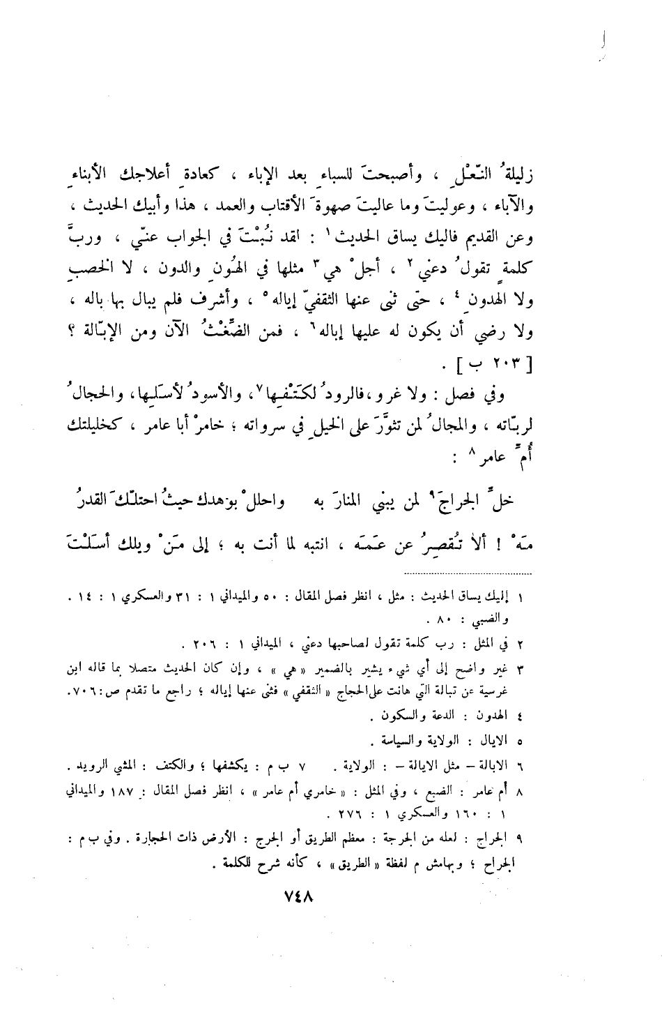 زليلة النعل، وأصبحت للسباء بعد الإباء، كعادة أعلاجك الأبناء والآباء، وعوليت وما عاليت صهوة الأقتاب والعمد، هذا وأبيك الحديث، وعن القديم فاليك يساق الحديث: لقد نبت في الجواب عني، ورب كلمة تقول دعني، أجل هي مثلها في الهون والدون، لا الخصب ولا الهدون، حتى ثنى عنها الثقفي إياله، وأشرف فلم يبال بها باله، ولا رضي أن يكون له عليها إباله، فمن الضغث الآن ومن الإبالة -[203ب] .