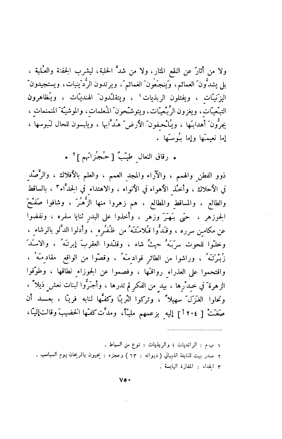ولا من أثار عن النقع المثار، ولا من شد الحلبة، ليشرب الجفنة والعلبة، بل يشدون العمائم، وينجعون الغمائم، ويرتدون الردينيات، ويستجيدون اليزنيات، ويفتلون الربذيات، ويتقلدون الهنديات، ويظاهرون التبعيات، ويغزون الربهيات، ويتوشحون المعلمات، والموشية المنمنمات، يجرون أهدابها، ويلحفون الأرض هدابها، ويلبسون للحال لبوسها، إما نعيمها وإما بوسطها: