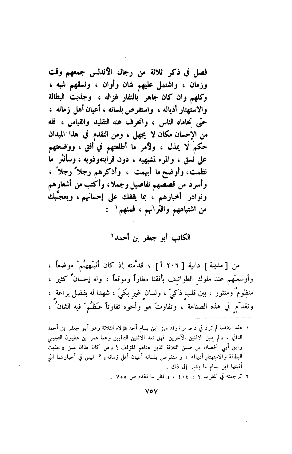 من [مدينة] دانية [206أ] ؛ قدمته إذ كان أنبههم موضعا، وأوسعهم عند ملوك الطوائف بأفقنا مطارا وموقعا، وله إحسان كثيرن منظوم ومنثور، بين قلب ذكي، ولسان غير بكي، شهدا له بفضل براعة، وتقدم في هذه الصناعة، وتفاوت هو وأخوه تفاوتا عظم فيه الشأن