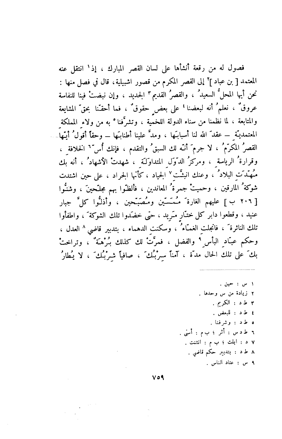 فصول له رقعة أنشأها على لسان القصر المبارك، إذ انتقل عنه المعتمد [بن عباد] إلى القصر المكرم من قصور اشبيلية، قال في فصل منها: نحن أيها المحل السعيد، والقصر القديم الجديد، وإن نبضت فينا للنفاسة عروق، نعلم أنه لبعضنا على بعض حقوق، فما أحقنا بحق المشايعة والمتابعة، لما نظمنا من سناء الدولة اللخمية، وتشرفنا به من ولاء المملكة المعتمدية - عقد الله لنا أسبابها، ومد علينا أطنابها - وحقا أقول أيها القصر المكرم، لا جرم أنه لك السبق والتقدم، فإنك أس الخلافة، وقرارة الرياسة، ومركز الدول المتداولة، شهدت الأشهاد، أنه بك مهدت البلاد، وعنك انبثت الجياد، كأنها الجراد، على حين اشتدت شوكة المارقين، وحميت جمرة المعاندين، فألظوا بهم مجلحين، وشنوا [206ب] عليهم الغارة ممسين ومصبحين، وأذلوا كل جبار عنيد، وقطعوا دابر كل ختار مريد، حتى خضدوا تلك الشوكة، وأطفأوا تلك النائرة، فانجلت الغماء، وسكنت الدهماء، بتدبير قاضي العدل، وحكم عباد البأس والفضل، فمرت لك كذلك برهة، وتراخت بك على تلك الحال مدة، آمنا سربك، صافيا شربك، لا يطار