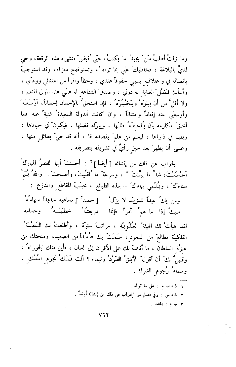 وما زلت أطلب من يجيد ما يكتب، حتى قيض منشىء هذه الرقعة، وحلي لدي بالبلاغة، فخاطبك عني بما تراه، وتستوضح مغزاه، وقد استوجب باتصاله بي واعتلاقه بسببي حقوقا عندي، وحظا وافرا من اعتنائي وودي، وأسألك فصل العناية به دوني، وصدق الشفاعة له عني عند المولى المنعم، ولا أقل من أن يبلوه ويخبره، فإن استحق بالإحسان إحسانا، أوسعه وأوسعني عنه إنعاما وامتنانا، وان كانت الدولة السعيدة غنية عنه فما أخلق مكارمه بأن يلحفه ظلها، ويبوئه فضلها، فيكون في خباياها، ويقيم في ذراها، ليعلم من علم بقصده لها، أنه قد حلي بطائل منها، وعسى أن يظهر بعد حين رأي في تشريفه بتصريفه.