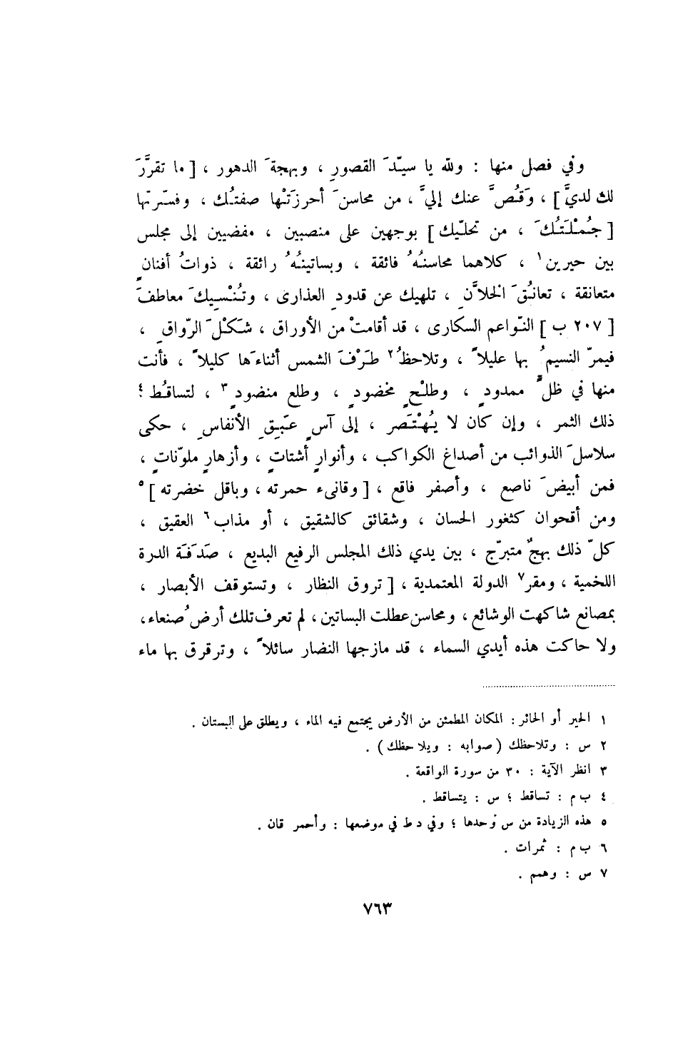 وفي فصل منها: ولله يا سيد القصور، وبهجة الدهور، [ما تقرر لك لدي] ، وقص عنك إلي، من محاسن أحرزتها صفتك، وفسرتها [جماتك، من تحليك] بوجهين على منصبين، مفضيين إلى مجلس بين حيرين، كلاهما محاسنه فائقة، وبساتينه رائقة، ذوات أفنان متعانقة، تعانق الخلان، تلهيك عن قدود العذارى، وتنسيك معاطف [207ب] النواعم السكارى، قد أقامت من الأوراق، شكل الرواق، فيمر النسيم بها عليلا، وتلاحظ طرف الشمس أثناءها كليلا، فأنت منها في ظل ممدود، وطلح مخضود، وطلع منضود لتساقط ذلك الثمر، وإن كان لا يهتصر، إلى آس عبق الأنفاس، حكى سلاسل الذوائب من أصداغ الكواكب، وأنوار أشتات، وأزهار نلونات، فمن أبيض ناصع، وأصفر فاقع، [وقانىء حمرته، وباقل خضرته] ومن أقحوان كثغور الحسان، وشقائق كالشقيق، أو مذاب العقيق، كل ذلك بهج متبرج، بين يدي ذلك المجلس الرفيع البديع، صدفة الدرة اللخمية، ومقر الدولة المعتمدية، [تروق النظار، وتستوقف الأبصار، بمصانع شاكهت الوشائع، ومحاسن عطلت البساتين، لم تعرف تلك أرض صنعاء، ولا حاكت هذه أيدي السماء، قد مازجها النضار سائلا، وترقرق بها ماء