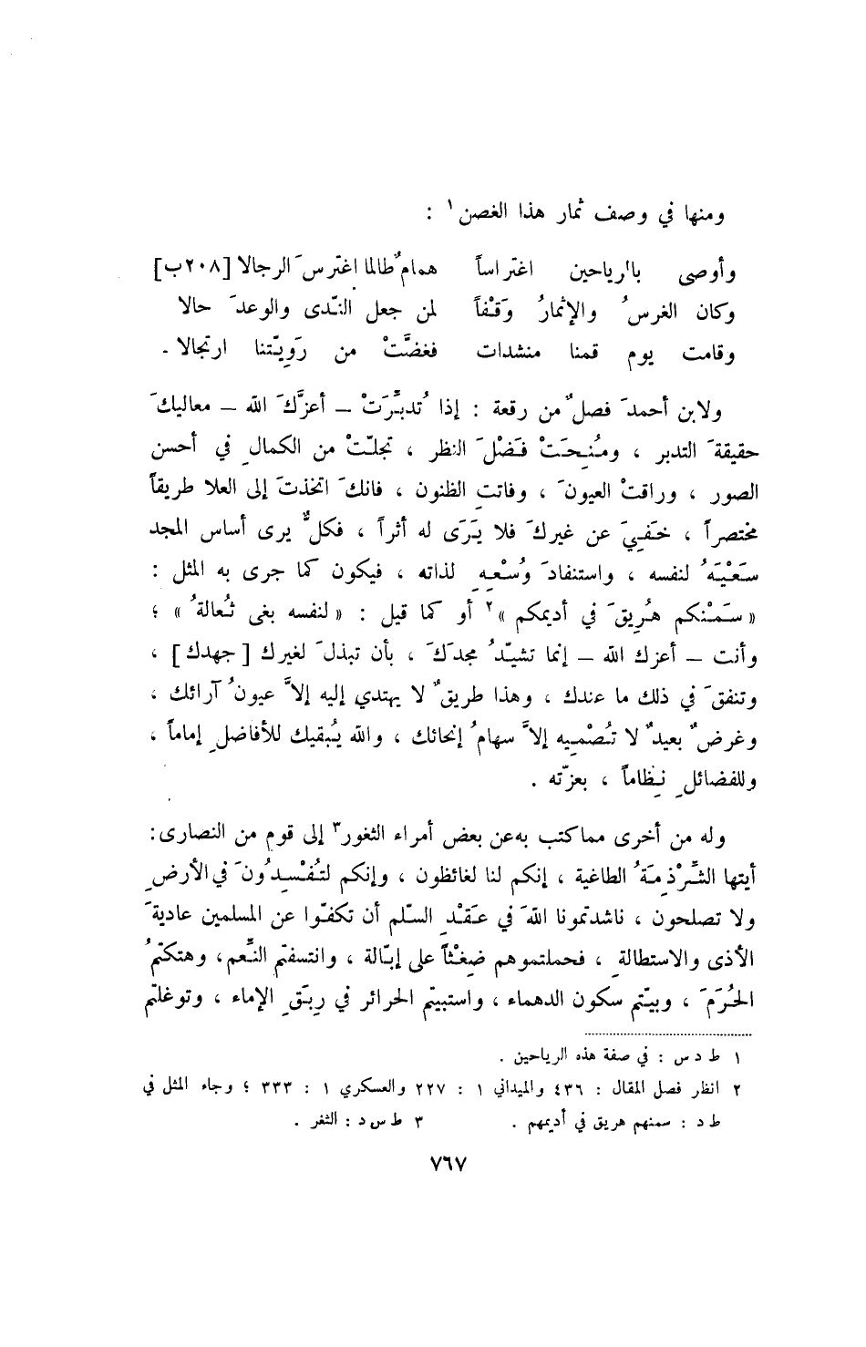 ولابن أحمد فصل من رقعة: إذا تدبرت - أعزك الله - معاليك حقيقة التدبر، ومنحت فضل النظر، تجلت من الكمال في أحسن الصور، وراقت العيون، وفاتت الظنون، فانك اتخذت إلى العلا طريقا مختصرا، خفي عن غيرك فلا يرى له أثرا، فكل يرى أساس المجد سعيه لنفسه، واستنفاد وسعه لذاته، فيكون كما جرى به المثل: " سمنكم هريق في أديمكم " أو كما قيل: " لنفسه بغى ثعاله "؛ وأنت - أعزك الله - إنما تشيد مجدك، بأن تبذل لغيرك [جهدك] ، وتنفق في ذلك ما عندك، وهذا طريق لا يهدي إليه عيون آرائك، وغرض بعيد لا تصميه إلا سهام إنحائك، والله يبقيك للأفاضل أماما، وللفضائل نظأما، بعزته.