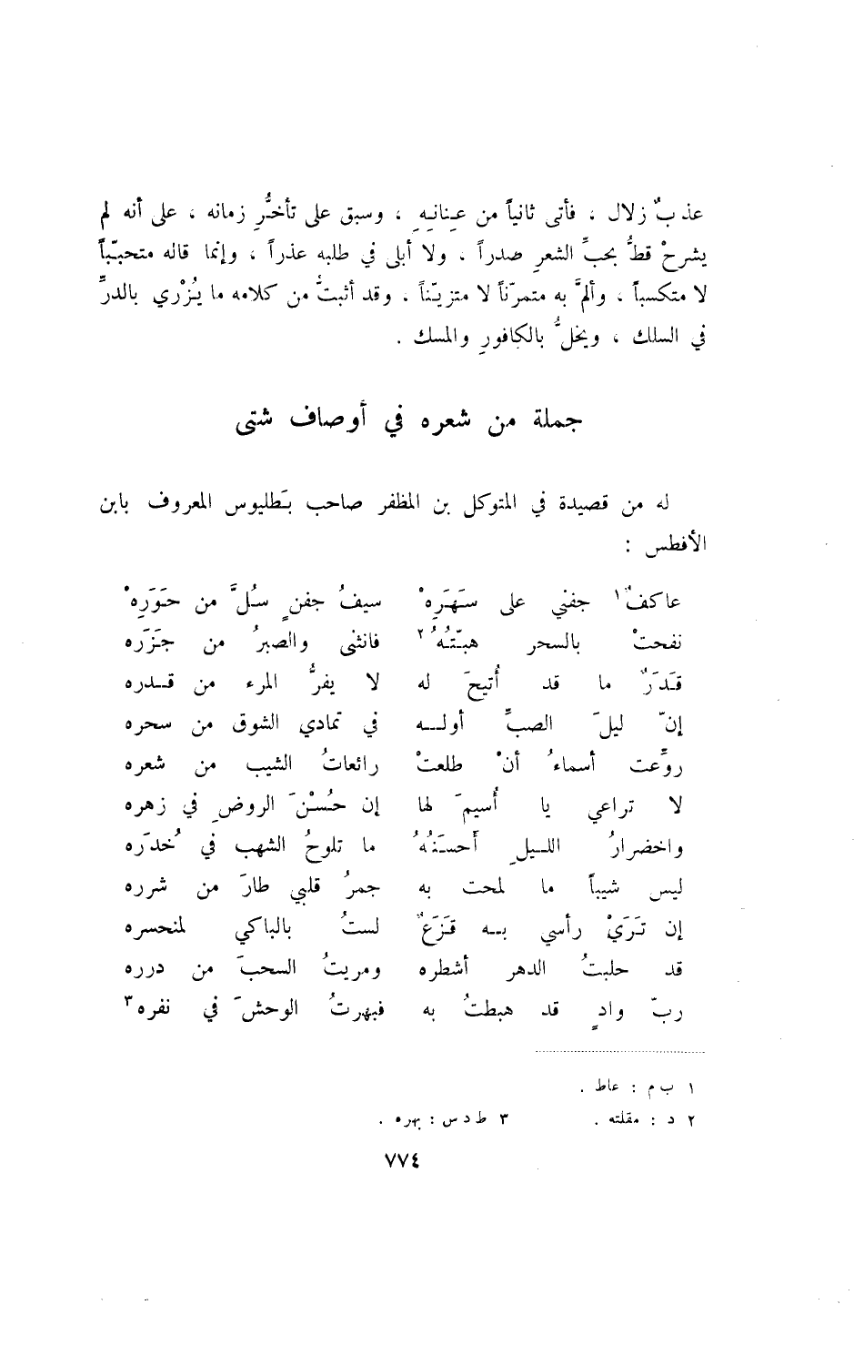 عذب زلال، فأتى ثانيا من عنانه، وسبق على تأخر زمانه، على أنه لم يشرح قط بحب الشعر صدرا، ولا أبلى في طلبه عذرا، وإنما قاله متحببا لا متكسبا، وألم به متمرنا لا متزينا، وقد أثبت من كلامه ما يزري بالدر في السلك، ويخل بالكافور والمسك.