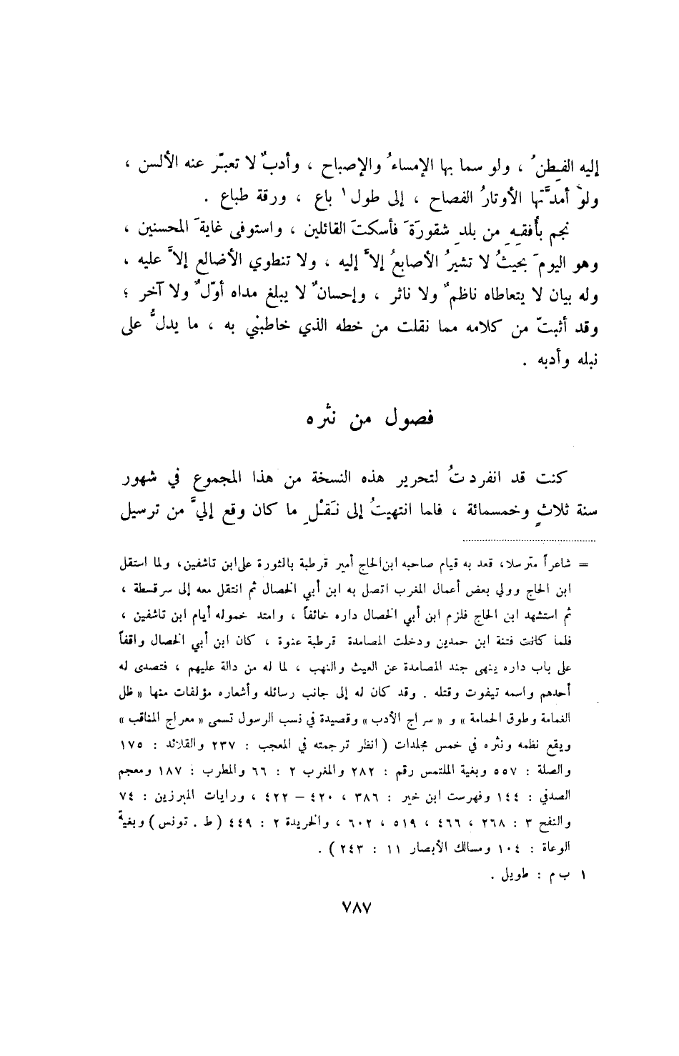 نجم بأفقه من بلد شقورى فأسكت القائلين، واستوفى غاية المحسنين، وهواليوم بحيث لا تشير الأصابع إلا إليه، ولا تنطوي الأضالع إلا عليه، وله بيان لا يتعاطاه ناظم ولا ناثر، وإحسان لا يبلغ مداه أول ولا آخر؛ وقد أثبت من كلامه مما نقلت من خطه الذي خاطبني به، ما يدل على نبله وأدبه.