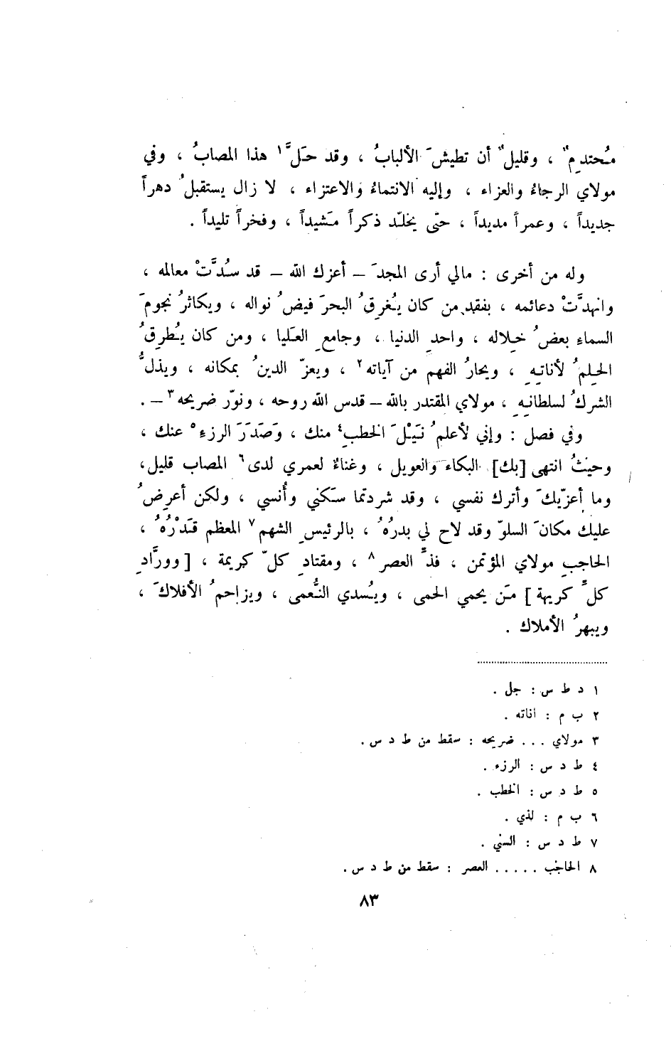 محتدم، وقليل أن تطيش الألباب، وقد حل هذا المصاب، وفي مولاي الرجاء والعزاء، وإليه الانتماء والاعتزاء، لا زال يستقبل دهرا جديدا، وعمرا مديدا، حتى يخلد ذكرا مشيدا، وفخرا تليدا.