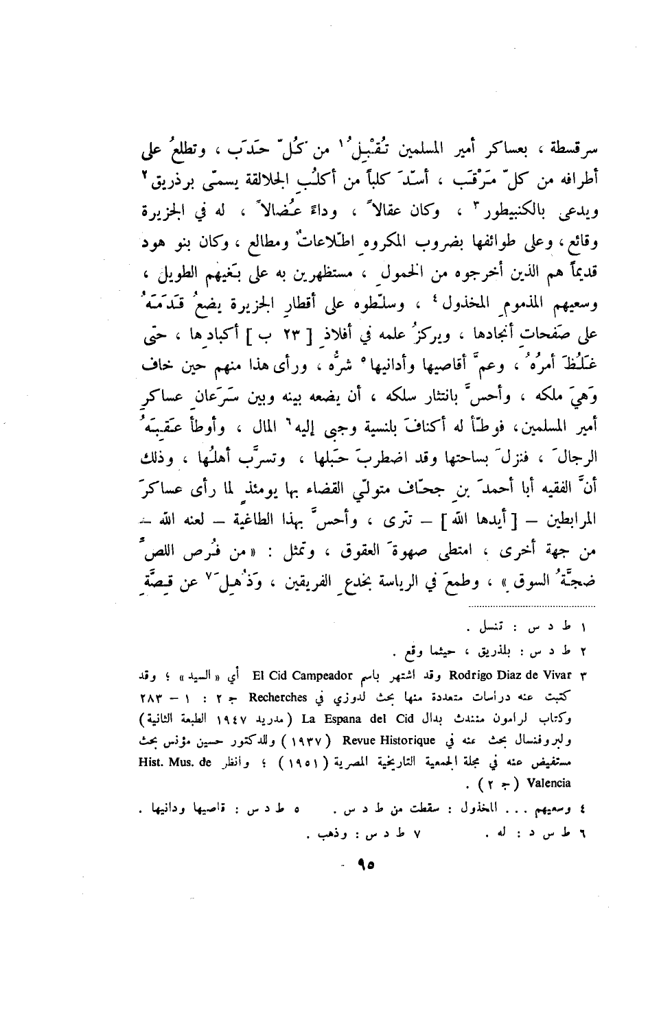 سرقسطة، بعساكر أمير المسلمين تقبل من كل حدب، وتطلع على أطرافه من كل مرقب، أسد كلبا من أكلب الجلالقة يسمى برذريق ويدعى بالكنبيطور، وكان عقالا، وداء عضالا، له في الجزيرة وقائع، وعلى طوائفها بضروب المكروه اطلاعات ومطالع، وكان بنو هود قديما هم الذين أخرجوه من الخمول، مستظهرين بع على بغيهم الطويل، وسعيهم المذموم المخذول، وسلطوه على أقطار الجزيرة يضع قدمه على صفحات أنجادها، ويركز علمه في أفلاذ [23ب] أكبادها، حتى غلظ أمره، وعم أقاصيها وأدانيها شره، ورأى هذا منهم حين خاف وهي ملكه، وأحس بانتثار سلكه، أن يضعه بينه وبين سرعان عساكر أمير المسلمين، فوطأ له أكناف بلنسية وجبى إليه المال، وأوطأ عقبه الرجال، فنزل بساحتها وقد اضطرب حبلها، وتسرب أهلها، وذلك أن الفقيه أبا أحمد بن جحاف متولي القضاء بها يومئذ لما رأى عساكر المرابطين -[أيدها الله]- تترى، وأحس بهذا الطاغية - لعنه الله - من جهة أخرى، امتطى صهوة العقوق، وتمثل: " من فرص اللص ضجة السوق "، وطمع في الرياسة بخدع الفريقين، وذهل عن قصة