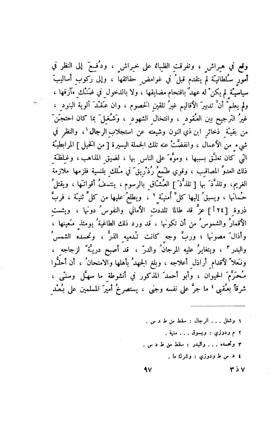 وقع في هراش، وتفرقت الظباء على خراش، ودفع إلى النظر في أمور سلطانية لم يتقدم قبل في غوامض حقائقها، وإلى ركوب أساليب سياسية لم يكن له عهد باقتحام مضايقها، ولا بالدخول في ضنك وآزقها، ولم يعلم أن تدبير الأقاليم غير تلقين الخصوم، وان عقد ألوية البنود، غير الترجيح بين العقود، وانتحال الشهود، وشغل بما كان احتجن من بقية ذخائر ابن ذي النون وشيعته عن استجلاب الرجال، والنظر في شيء من الأعمال، وانفضت عنه تلك الجملة اليسيرة [من الخيل] المرابطية التي كان تعلق بسببها، وموه على الناس بها، لضيق المذاهب، وغلظة ذلك العدو المصاقب، وقوي طمع رذريق في ملك بلنسية فلزمها ملازمة الغريم، وتلذذ بها [تلذذ] العشاق بالرسوم، ينتسف أقواتها، ويقتل حماتها، ويسبق إليها كل أمنية، ويطلع عليها من كل ثنية، فرب ذروة [24أ] عز قد طالما تلددت الأماني والنفوس دونها، ويئست الأقمار والشموس من أن تكونها، قد ورد ذلك الطاغية يومئذ معينها، وأذال مصونها؛ ورب وجه كانت تدميه الذر، وتحسده الشمس والبدر، ويتغاير عليه المرجان والدر، قد أصبح درية لزجاجه، ونعلا لأقدام أراذل أعلاجه، وبلغ الجهد بأهلها والامتحان، أن أحلوا محرم الحيوان، وأبو أحمد المذكور في أنشوطة ما سهل وسنى شرقا بعقبى ما جر على نفسه وجنى، يستصرخ أمير المسلمين على بعد