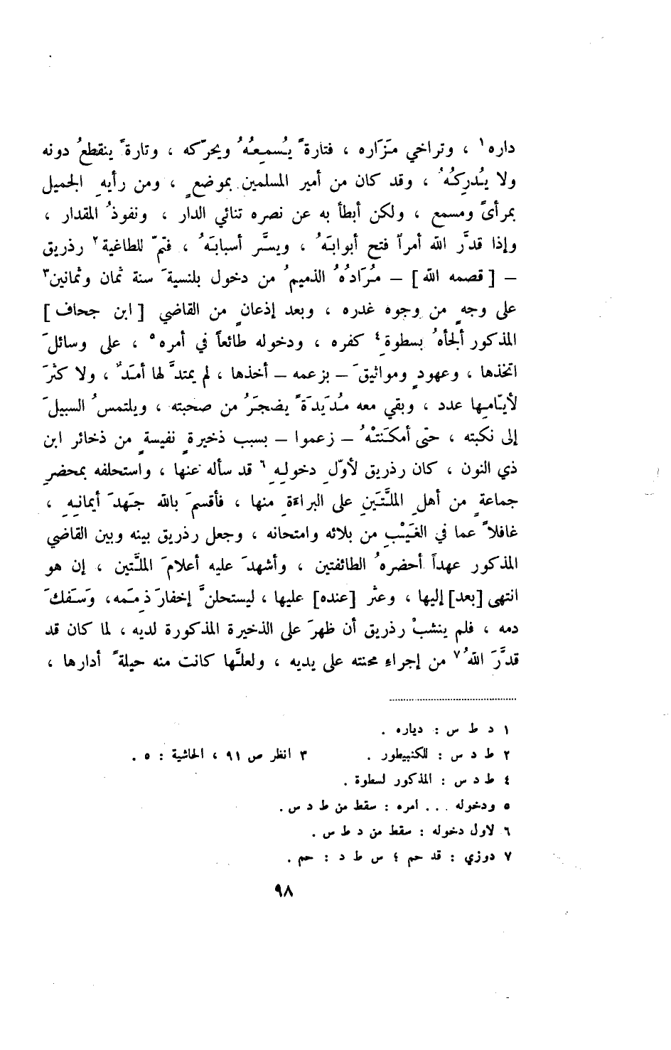 داره، وتراخي مزاره، فتارة يسمعه ويحركه، وتارة ينقطع دونه ولا يدركه، وقد كان من أمير المسلمين بموضع، ومن رأيه الجميل بمرأى ومسمع، ولكن أبطأ به عن نصره تنائي الدار، ونفوذ المقدار، وإذا قدر الله أمرا فتح أبوابه، ويسر أسبابه، فتم للطاغية رذريق -[قصمه الله]- مراده الذميم من دخول بلنسية سنة ثمان وثمانين على وجه من وجوه غدره، وبعد إذعان من القاضي [ابن جحاف] المذكور ألجأه بسطوة كفره، ودخوله طائعا في أمره، على وسائل اتخذها، وعهود ومواثيق - بزعمه - أخذها، لم يمتد لها أمد، ولا كثر لأيامها عدد، وبقي معه مديدة يضجر من صحبته، ويلتمس السبيل إلى نكبته، حتى أمكنته - زعموا - بسبب ذخيرة نفيسة من ذخائر ابن ذي النون، كان رذريق لأول دخوله قد سأله عنها، واستحلفه بمحضر جماعة من أهل الملتين على البراءة منها، فأقسم بالله جهد أيمانه، غافلا عما في الغيب من بلائه وامتحانه، وجعل رذريق بينه وبين القاضي المذكور عهدا أحضره الطائفتين، وأشهد عليه أعلام الملتين، إن هو انتهى [بعد] إليها، وعثر [عنده] عليها، ليستحلن إخفار ذممه، وسفك دمه، فلم ينشب رذريق أن ظهر على الذخيرة المذكورة لديه، لما كان قد قدر الله من إجراء محنته على يديه، ولعلها كانت منه حيلة أدارها