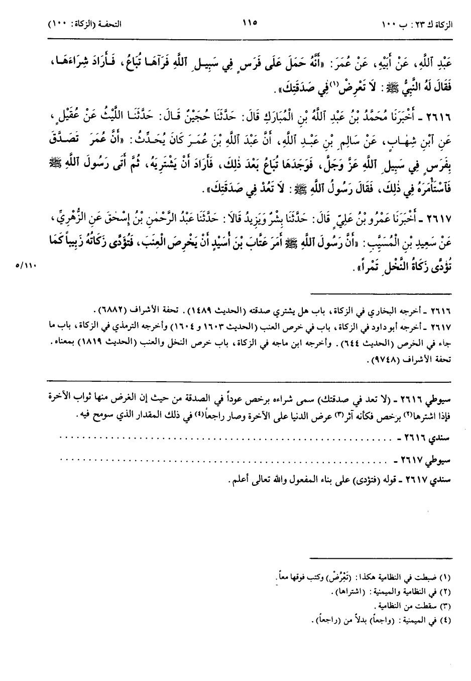 2616 - أَخْبَرَنَا مُحَمَّدُ بْنُ عَبْدِ اللَّهِ بْنِ الْمُبَارَكِ قَالَ أَنْبَأَنَا حُجَيْنٌ قَالَ حَدَّثَنَا اللَّيْثُ عَنْ عُقَيْلٍ عَنْ ابْنِ شِهَابٍ عَنْ سَالِمِ بْنِ عَبْدِ اللَّهِ أَنَّ عَبْدَ اللَّهِ بْنَ عُمَرَ كَانَ يُحَدِّثُ أَنَّ عُمَرَ تَصَدَّقَ بِفَرَسٍ فِي سَبِيلِ اللَّهِ عَزَّ وَجَلَّ فَوَجَدَهَا تُبَاعُ بَعْدَ ذَلِكَ فَأَرَادَ أَنْ يَشْتَرِيَهُ ثُمَّ أَتَى رَسُولَ اللَّهِ صَلَّى اللَّهُ عَلَيْهِ وَسَلَّمَ فَاسْتَأْمَرَهُ فِي ذَلِكَ فَقَالَ رَسُولُ اللَّهِ صَلَّى اللَّهُ عَلَيْهِ وَسَلَّمَ لَا تَعُدْ فِي صَدَقَتِكَ
