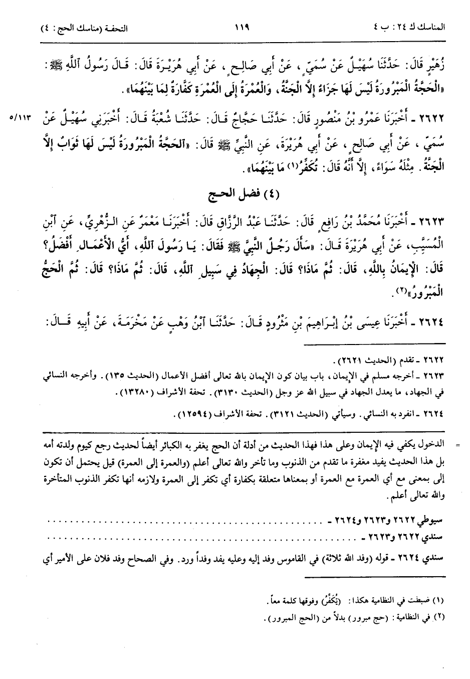 2622 - أَخْبَرَنَا عَمْرُو بْنُ مَنْصُورٍ قَالَ حَدَّثَنَا حَجَّاجٌ قَالَ حَدَّثَنَا شُعْبَةُ قَالَ أَخْبَرَنِي سُهَيْلٌ عَنْ سُمَيٍّ عَنْ أَبِي صَالِحٍ عَنْ أَبِي هُرَيْرَةَ عَنْ النَّبِيِّ صَلَّى اللَّهُ عَلَيْهِ وَسَلَّمَ قَالَ الْحَجَّةُ الْمَبْرُورَةُ لَيْسَ لَهَا ثَوَابٌ إِلَّا الْجَنَّةُ مِثْلَهُ سَوَاءً إِلَّا أَنَّهُ قَالَ تُكَفِّرُ مَا بَيْنَهُمَا